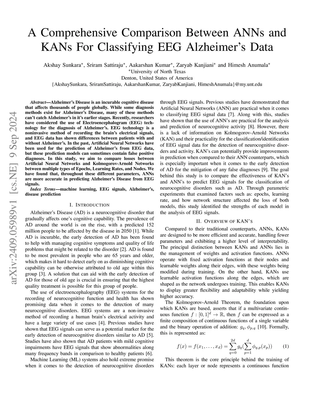 Alzheimer's Disease is an incurable cognitive condition that affects thousands of people globally. While some diagnostic methods exist for Alzheimer's Disease, many of these methods cannot detect Alzheimer's in its earlier stages. Recently, researchers have explored the use of Electroencephalogram (EEG) technology for diagnosing Alzheimer's. EEG is a noninvasive method of recording the brain's electrical signals, and EEG data has shown distinct differences between patients with and without Alzheimer's. In the past, Artificial Neural Networks (ANNs) have been used to predict Alzheimer's from EEG data, but these models sometimes produce false positive diagnoses. This study aims to compare losses between ANNs and Kolmogorov-Arnold Networks (KANs) across multiple types of epochs, learning rates, and nodes. The results show that across these different parameters, ANNs are more accurate in predicting Alzheimer's Disease from EEG signals.
