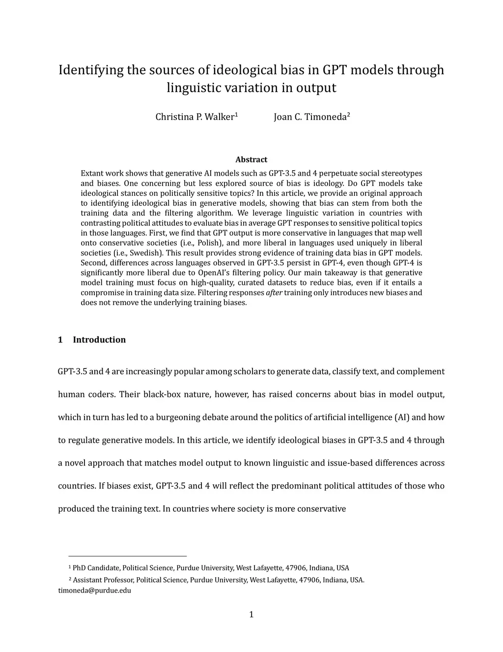 Extant work shows that generative AI models such as GPT-3.5 and 4 perpetuate social stereotypes and biases. One concerning but less explored source of bias is ideology. Do GPT models take ideological stances on politically sensitive topics? In this article, we provide an original approach to identifying ideological bias in generative models, showing that bias can stem from both the training data and the filtering algorithm. We leverage linguistic variation in countries with contrasting political attitudes to evaluate bias in average GPT responses to sensitive political topics in those languages. First, we find that GPT output is more conservative in languages that map well onto conservative societies (i.e., Polish), and more liberal in languages used uniquely in liberal societies (i.e., Swedish). This result provides strong evidence of training data bias in GPT models. Second, differences across languages observed in GPT-3.5 persist in GPT-4, even though GPT-4 is significantly more liberal due to OpenAI's filtering policy. Our main takeaway is that generative model training must focus on high-quality, curated datasets to reduce bias, even if it entails a compromise in training data size. Filtering responses after training only introduces new biases and does not remove the underlying training biases.