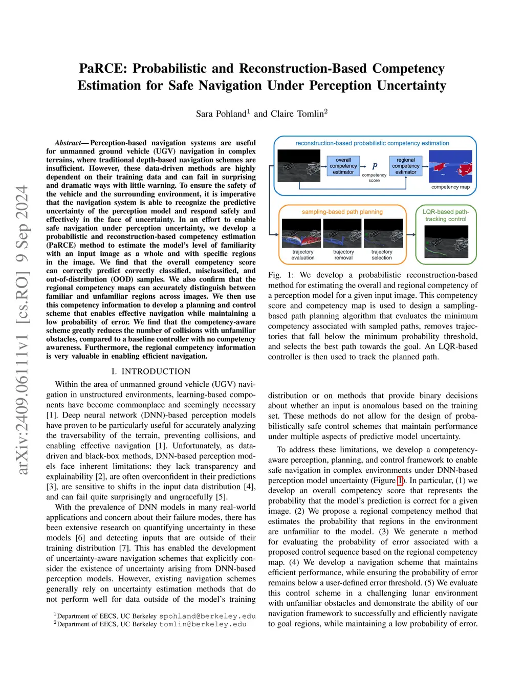 Perception-based navigation systems are useful for unmanned ground vehicle (UGV) navigation in complex terrains, where traditional depth-based navigation schemes are insufficient. However, these data-driven methods are highly dependent on their training data and can fail in surprising and dramatic ways with little warning. To ensure the safety of the vehicle and the surrounding environment, it is imperative that the navigation system is able to recognize the predictive uncertainty of the perception model and respond safely and effectively in the face of uncertainty. In an effort to enable safe navigation under perception uncertainty, we develop a probabilistic and reconstruction-based competency estimation (PaRCE) method to estimate the model's level of familiarity with an input image as a whole and with specific regions in the image. We find that the overall competency score can correctly predict correctly classified, misclassified, and out-of-distribution (OOD) samples. We also confirm that the regional competency maps can accurately distinguish between familiar and unfamiliar regions across images. We then use this competency information to develop a planning and control scheme that enables effective navigation while maintaining a low probability of error. We find that the competency-aware scheme greatly reduces the number of collisions with unfamiliar obstacles, compared to a baseline controller with no competency awareness. Furthermore, the regional competency information is very valuable in enabling efficient navigation.
