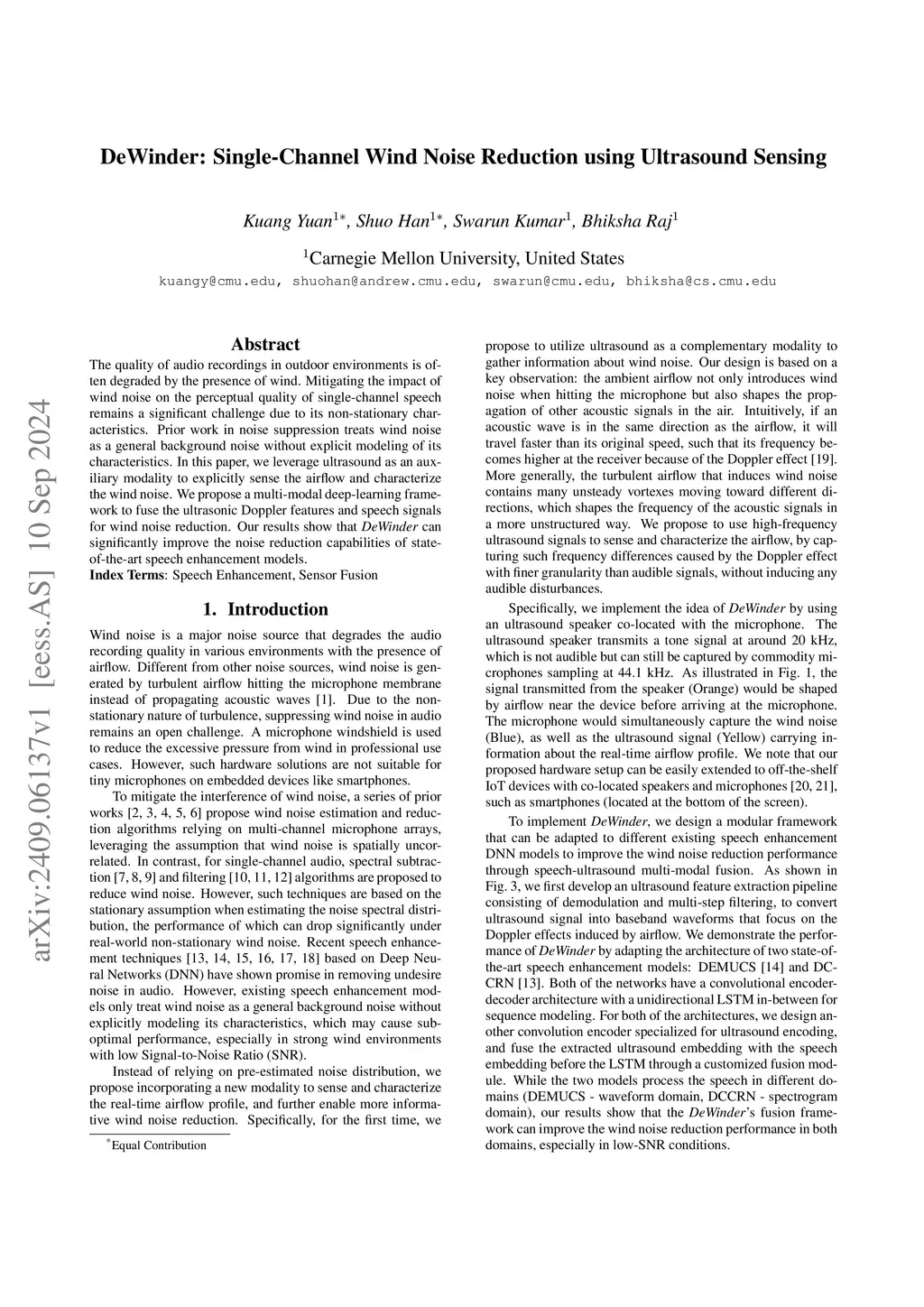 The quality of audio recordings in outdoor environments is often degraded by the presence of wind. Mitigating the impact of wind noise on the perceptual quality of single-channel speech remains a significant challenge due to its non-stationary characteristics. Prior work in noise suppression treats wind noise as a general background noise without explicit modeling of its characteristics. In this paper, we leverage ultrasound as an auxiliary modality to explicitly sense the airflow and characterize the wind noise. We propose a multi-modal deep-learning framework to fuse the ultrasonic Doppler features and speech signals for wind noise reduction. Our results show that DeWinder can significantly improve the noise reduction capabilities of state-of-the-art speech enhancement models.