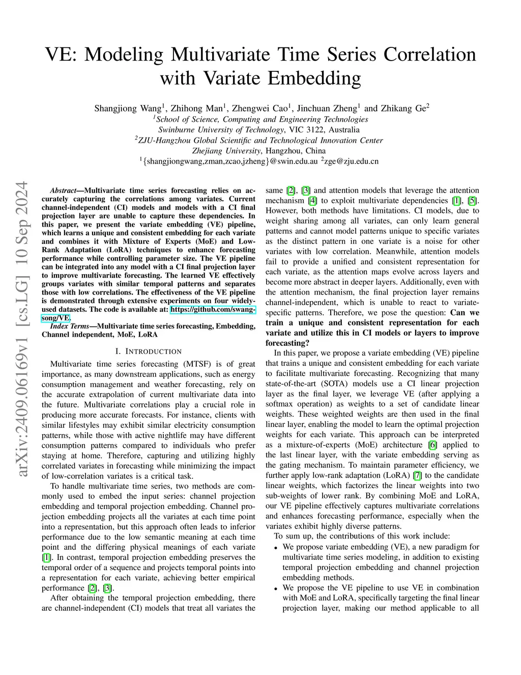VE: Modeling Multivariate Time Series Correlation with Variate Embedding