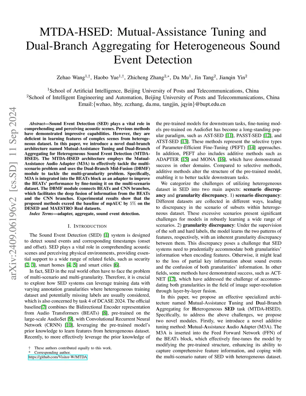 Sound Event Detection (SED) plays a vital role in comprehending and perceiving acoustic scenes. Previous methods have demonstrated impressive capabilities. However, they are deficient in learning features of complex scenes from heterogeneous dataset. In this paper, we introduce a novel dual-branch architecture named Mutual-Assistance Tuning and Dual-Branch Aggregating for Heterogeneous Sound Event Detection (MTDA-HSED). The MTDA-HSED architecture employs the Mutual-Assistance Audio Adapter (M3A) to effectively tackle the multi-scenario problem and uses the Dual-Branch Mid-Fusion (DBMF) module to tackle the multi-granularity problem. Specifically, M3A is integrated into the BEATs block as an adapter to improve the BEATs' performance by fine-tuning it on the multi-scenario dataset. The DBMF module connects BEATs and CNN branches, which facilitates the deep fusion of information from the BEATs and the CNN branches. Experimental results show that the proposed methods exceed the baseline of mpAUC by \textbf{} on the DESED and MAESTRO Real datasets. Code is available at https://github.com/Visitor-W/MTDA.