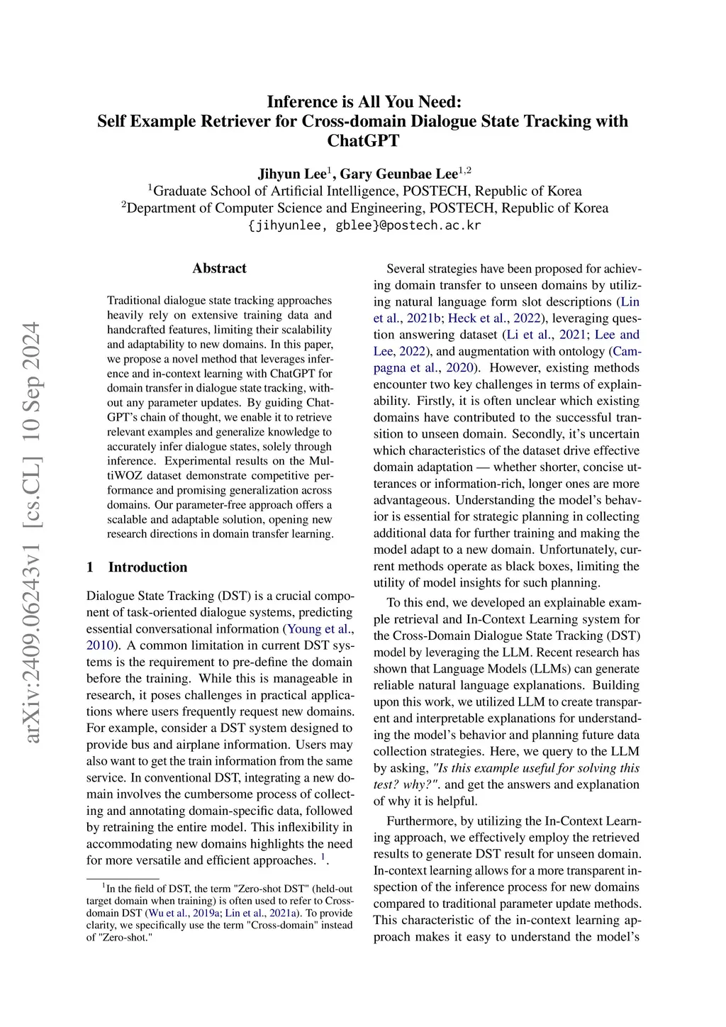 Traditional dialogue state tracking approaches heavily rely on extensive training data and handcrafted features, limiting their scalability and adaptability to new domains. In this paper, we propose a novel method that leverages inference and in-context learning with ChatGPT for domain transfer in dialogue state tracking, without any parameter updates. By guiding ChatGPT's chain of thought, we enable it to retrieve relevant examples and generalize knowledge to accurately infer dialogue states, solely through inference. Experimental results on the MultiWOZ dataset demonstrate competitive performance and promising generalization across domains. Our parameter-free approach offers a scalable and adaptable solution, opening new research directions in domain transfer learning.