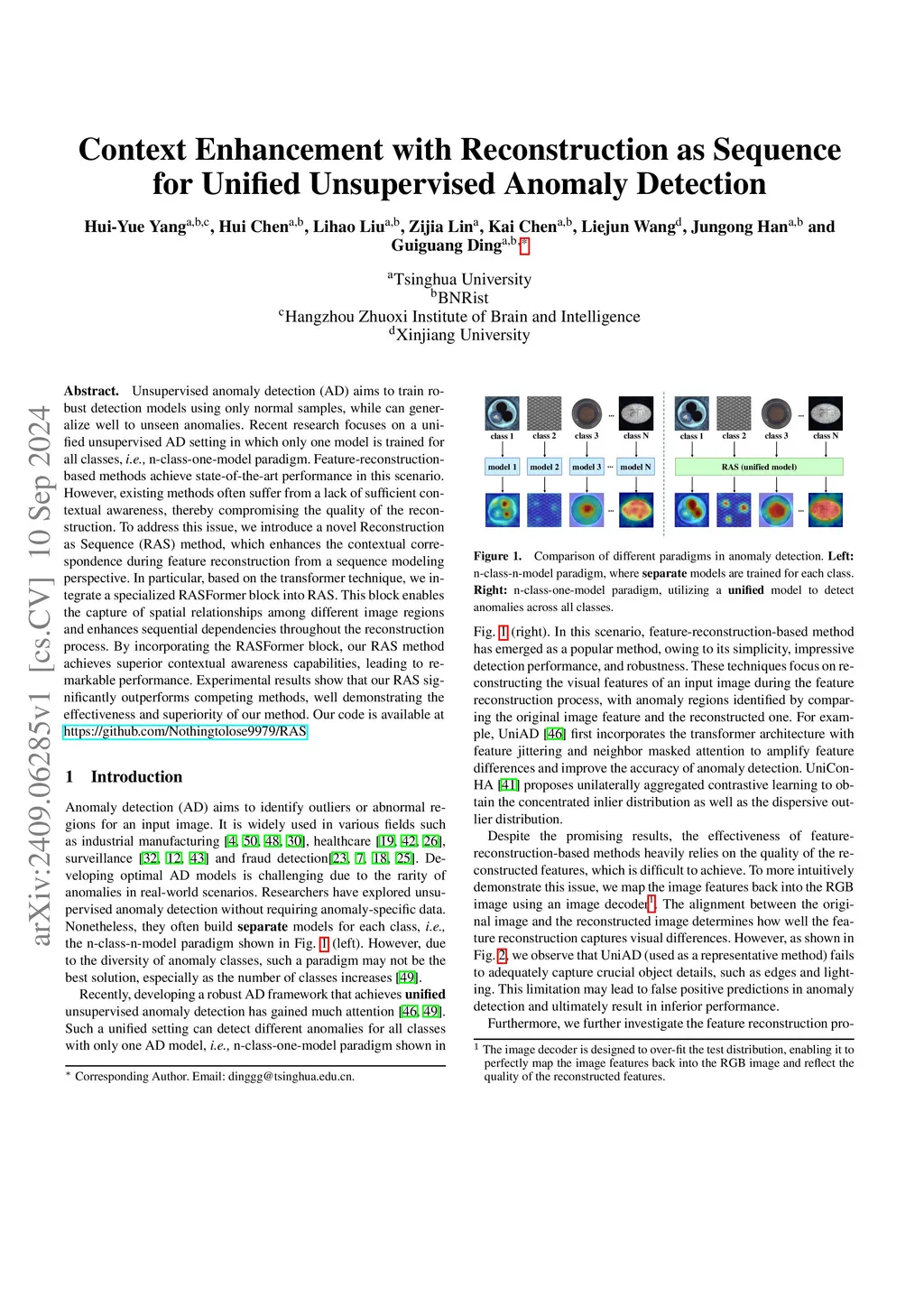 Unsupervised anomaly detection (AD) aims to train robust detection models using only normal samples, while can generalize well to unseen anomalies. Recent research focuses on a unified unsupervised AD setting in which only one model is trained for all classes, i.e., n-class-one-model paradigm. Feature-reconstruction-based methods achieve state-of-the-art performance in this scenario. However, existing methods often suffer from a lack of sufficient contextual awareness, thereby compromising the quality of the reconstruction. To address this issue, we introduce a novel Reconstruction as Sequence (RAS) method, which enhances the contextual correspondence during feature reconstruction from a sequence modeling perspective. In particular, based on the transformer technique, we integrate a specialized RASFormer block into RAS. This block enables the capture of spatial relationships among different image regions and enhances sequential dependencies throughout the reconstruction process. By incorporating the RASFormer block, our RAS method achieves superior contextual awareness capabilities, leading to remarkable performance. Experimental results show that our RAS significantly outperforms competing methods, well demonstrating the effectiveness and superiority of our method. Our code is available at https://github.com/Nothingtolose9979/RAS.