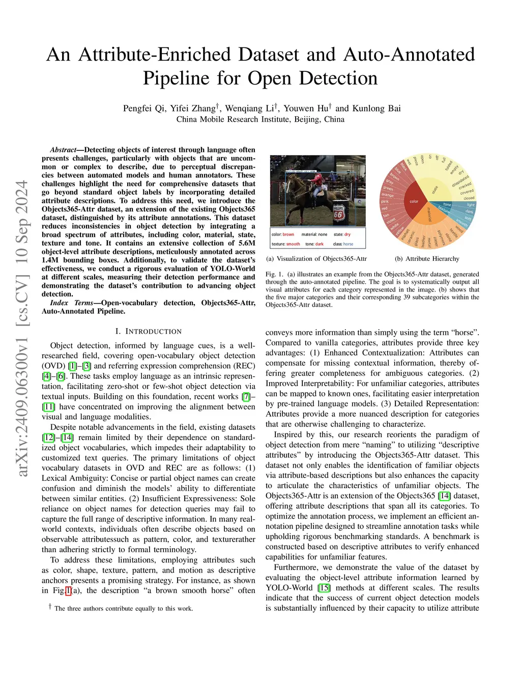 Detecting objects of interest through language often presents challenges, particularly with objects that are uncommon or complex to describe, due to perceptual discrepancies between automated models and human annotators. These challenges highlight the need for comprehensive datasets that go beyond standard object labels by incorporating detailed attribute descriptions. To address this need, we introduce the Objects365-Attr dataset, an extension of the existing Objects365 dataset, distinguished by its attribute annotations. This dataset reduces inconsistencies in object detection by integrating a broad spectrum of attributes, including color, material, state, texture and tone. It contains an extensive collection of 5.6M object-level attribute descriptions, meticulously annotated across 1.4M bounding boxes. Additionally, to validate the dataset's effectiveness, we conduct a rigorous evaluation of YOLO-World at different scales, measuring their detection performance and demonstrating the dataset's contribution to advancing object detection.
