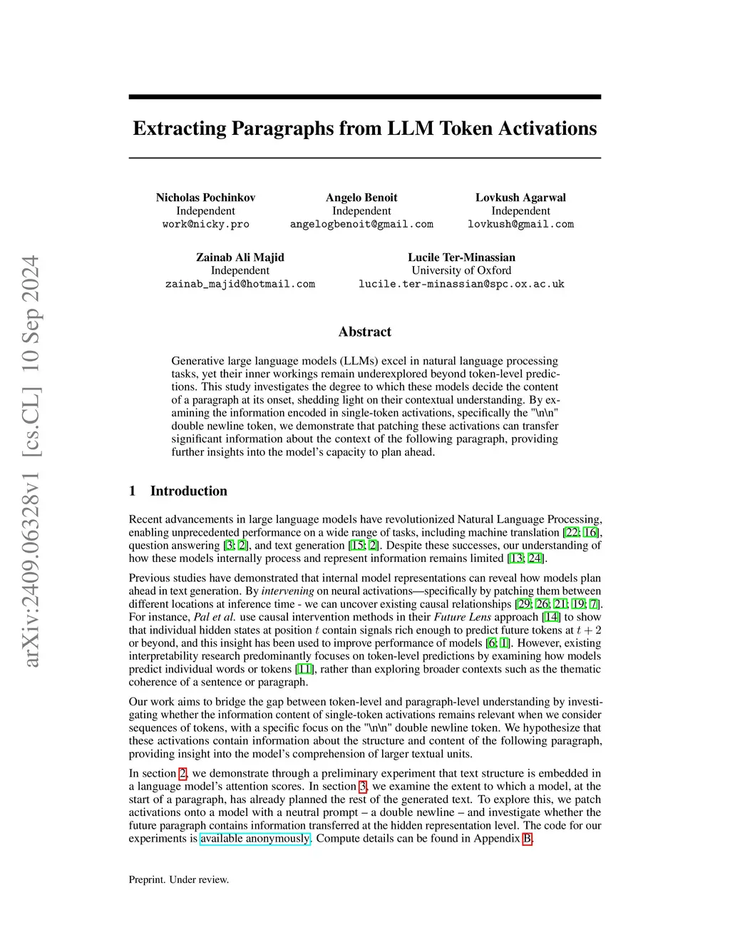 Generative large language models (LLMs) excel in natural language processing tasks, yet their inner workings remain underexplored beyond token-level predictions. This study investigates the degree to which these models decide the content of a paragraph at its onset, shedding light on their contextual understanding. By examining the information encoded in single-token activations, specifically the "\textbackslash n\textbackslash n" double newline token, we demonstrate that patching these activations can transfer significant information about the context of the following paragraph, providing further insights into the model's capacity to plan ahead.