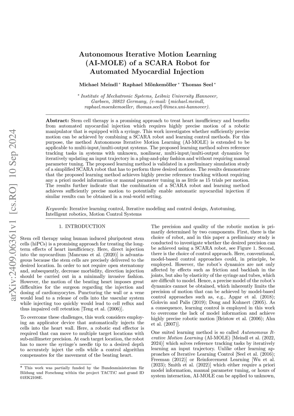 Stem cell therapy is a promising approach to treat heart insufficiency and benefits from automated myocardial injection which requires highly precise motion of a robotic manipulator that is equipped with a syringe. This work investigates whether sufficiently precise motion can be achieved by combining a SCARA robot and learning control methods. For this purpose, the method Autonomous Iterative Motion Learning (AI-MOLE) is extended to be applicable to multi-input/multi-output systems. The proposed learning method solves reference tracking tasks in systems with unknown, nonlinear, multi-input/multi-output dynamics by iteratively updating an input trajectory in a plug-and-play fashion and without requiring manual parameter tuning. The proposed learning method is validated in a preliminary simulation study of a simplified SCARA robot that has to perform three desired motions. The results demonstrate that the proposed learning method achieves highly precise reference tracking without requiring any a priori model information or manual parameter tuning in as little as 15 trials per motion. The results further indicate that the combination of a SCARA robot and learning method achieves sufficiently precise motion to potentially enable automatic myocardial injection if similar results can be obtained in a real-world setting.