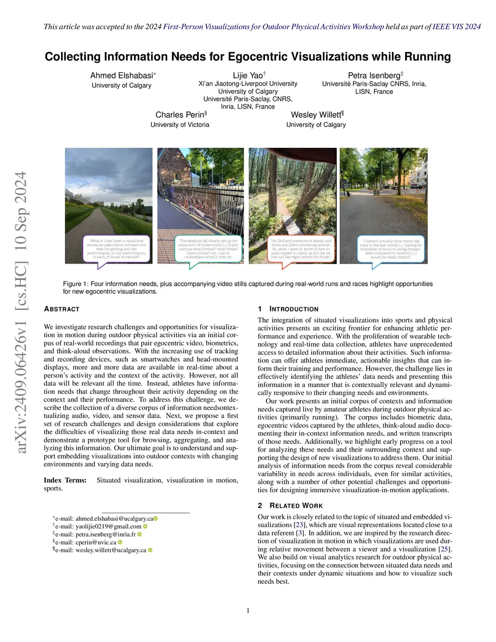 We investigate research challenges and opportunities for visualization in motion during outdoor physical activities via an initial corpus of real-world recordings that pair egocentric video, biometrics, and think-aloud observations. With the increasing use of tracking and recording devices, such as smartwatches and head-mounted displays, more and more data are available in real-time about a person's activity and the context of the activity. However, not all data will be relevant all the time. Instead, athletes have information needs that change throughout their activity depending on the context and their performance. To address this challenge, we describe the collection of a diverse corpus of information needs paired with contextualizing audio, video, and sensor data. Next, we propose a first set of research challenges and design considerations that explore the difficulties of visualizing those real data needs in-context and demonstrate a prototype tool for browsing, aggregating, and analyzing this information. Our ultimate goal is to understand and support embedding visualizations into outdoor contexts with changing environments and varying data needs.