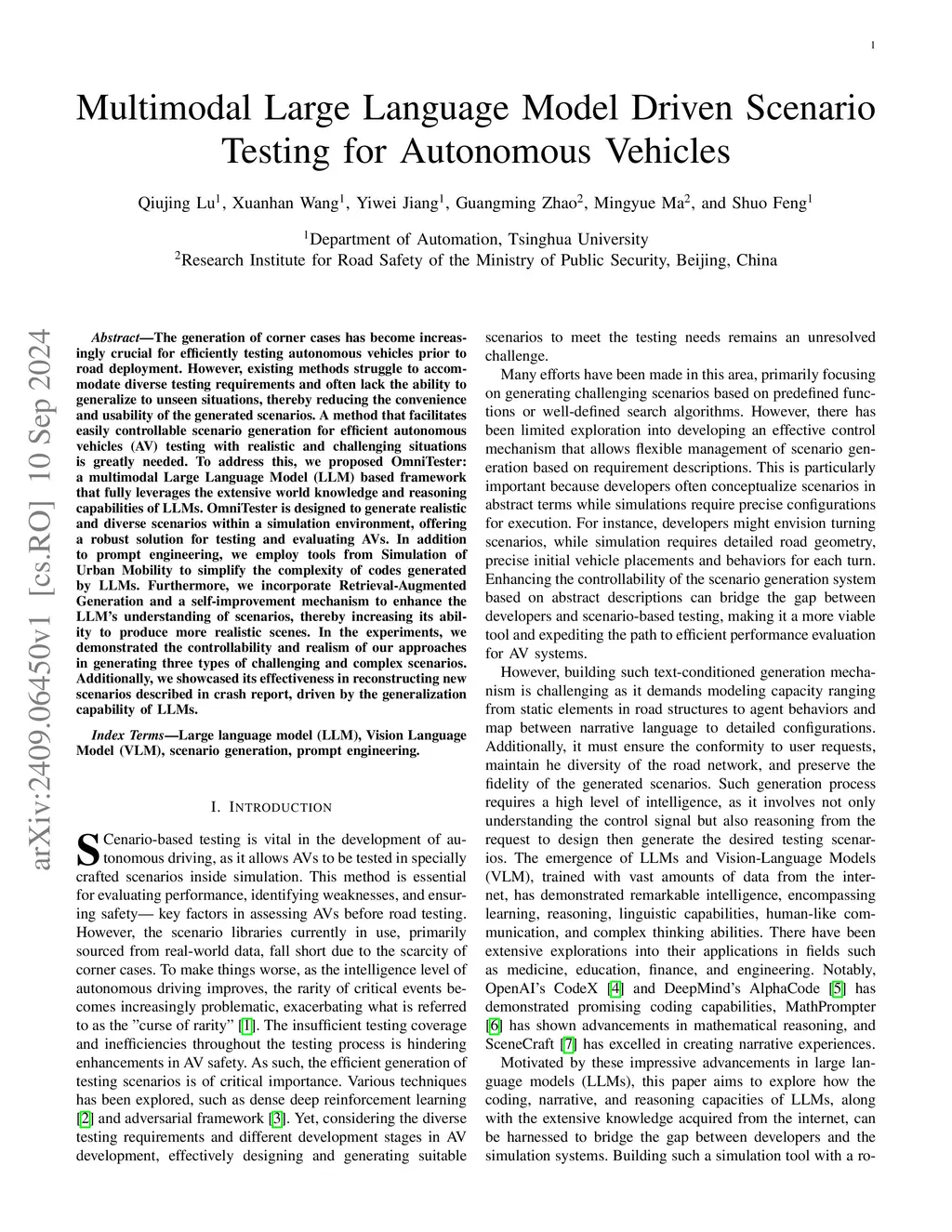 The generation of corner cases has become increasingly crucial for efficiently testing autonomous vehicles prior to road deployment. However, existing methods struggle to accommodate diverse testing requirements and often lack the ability to generalize to unseen situations, thereby reducing the convenience and usability of the generated scenarios. A method that facilitates easily controllable scenario generation for efficient autonomous vehicles (AV) testing with realistic and challenging situations is greatly needed. To address this, we proposed OmniTester: a multimodal Large Language Model (LLM) based framework that fully leverages the extensive world knowledge and reasoning capabilities of LLMs. OmniTester is designed to generate realistic and diverse scenarios within a simulation environment, offering a robust solution for testing and evaluating AVs. In addition to prompt engineering, we employ tools from Simulation of Urban Mobility to simplify the complexity of codes generated by LLMs. Furthermore, we incorporate Retrieval-Augmented Generation and a self-improvement mechanism to enhance the LLM's understanding of scenarios, thereby increasing its ability to produce more realistic scenes. In the experiments, we demonstrated the controllability and realism of our approaches in generating three types of challenging and complex scenarios. Additionally, we showcased its effectiveness in reconstructing new scenarios described in crash report, driven by the generalization capability of LLMs.