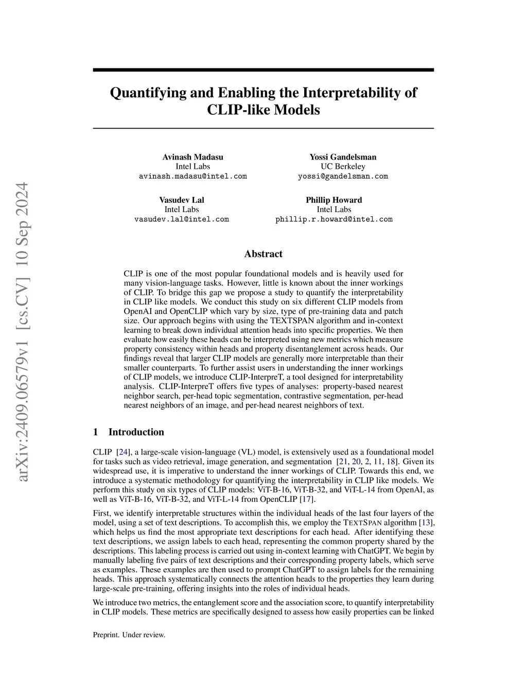 CLIP is one of the most popular foundational models and is heavily used for many vision-language tasks. However, little is known about the inner workings of CLIP. To bridge this gap we propose a study to quantify the interpretability in CLIP like models. We conduct this study on six different CLIP models from OpenAI and OpenCLIP which vary by size, type of pre-training data and patch size. Our approach begins with using the TEXTSPAN algorithm and in-context learning to break down individual attention heads into specific properties. We then evaluate how easily these heads can be interpreted using new metrics which measure property consistency within heads and property disentanglement across heads. Our findings reveal that larger CLIP models are generally more interpretable than their smaller counterparts. To further assist users in understanding the inner workings of CLIP models, we introduce CLIP-InterpreT, a tool designed for interpretability analysis. CLIP-InterpreT offers five types of analyses: property-based nearest neighbor search, per-head topic segmentation, contrastive segmentation, per-head nearest neighbors of an image, and per-head nearest neighbors of text.