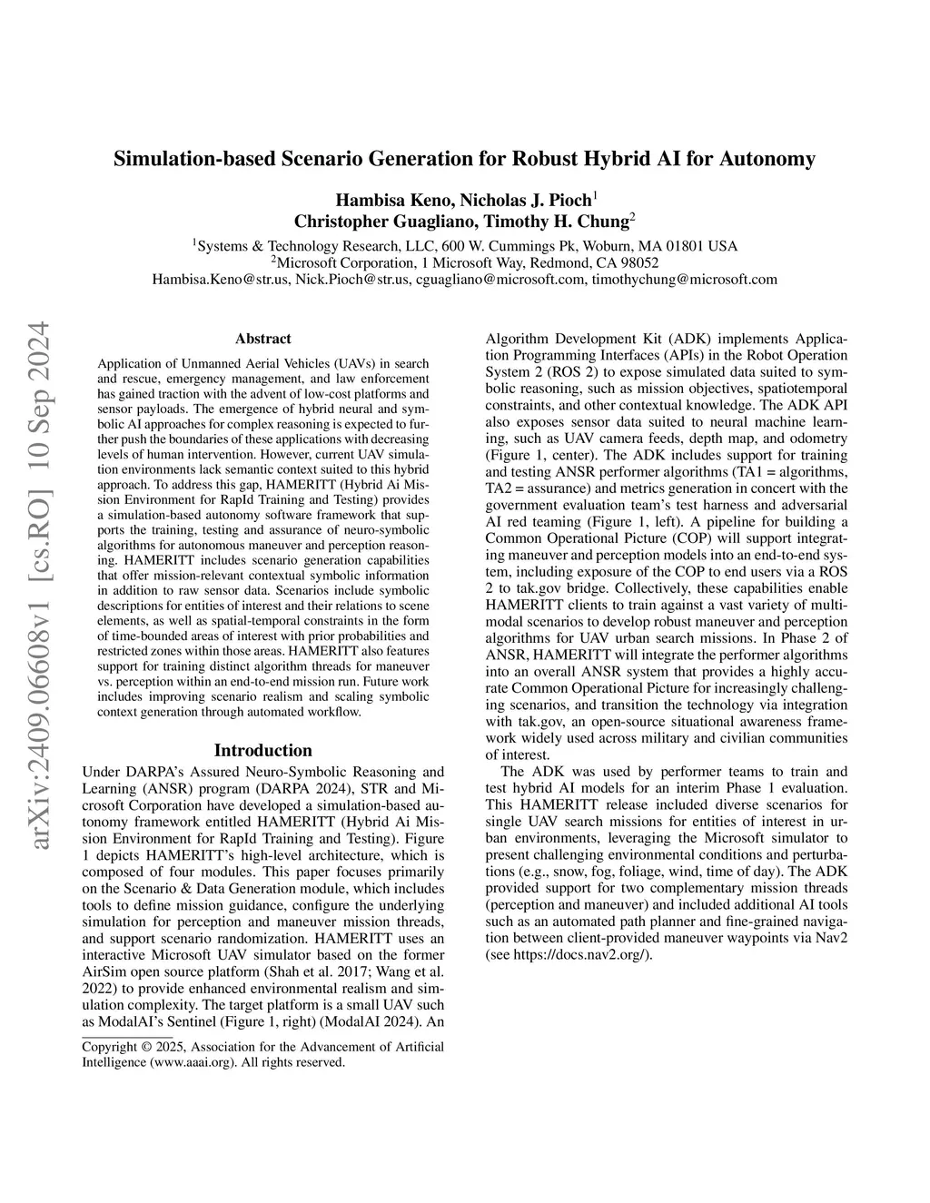 Application of Unmanned Aerial Vehicles (UAVs) in search and rescue, emergency management, and law enforcement has gained traction with the advent of low-cost platforms and sensor payloads. The emergence of hybrid neural and symbolic AI approaches for complex reasoning is expected to further push the boundaries of these applications with decreasing levels of human intervention. However, current UAV simulation environments lack semantic context suited to this hybrid approach. To address this gap, HAMERITT (Hybrid Ai Mission Environment for RapId Training and Testing) provides a simulation-based autonomy software framework that supports the training, testing and assurance of neuro-symbolic algorithms for autonomous maneuver and perception reasoning. HAMERITT includes scenario generation capabilities that offer mission-relevant contextual symbolic information in addition to raw sensor data. Scenarios include symbolic descriptions for entities of interest and their relations to scene elements, as well as spatial-temporal constraints in the form of time-bounded areas of interest with prior probabilities and restricted zones within those areas. HAMERITT also features support for training distinct algorithm threads for maneuver vs. perception within an end-to-end mission run. Future work includes improving scenario realism and scaling symbolic context generation through automated workflow.