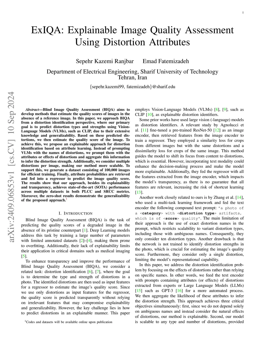 Blind Image Quality Assessment (BIQA) aims to develop methods that estimate the quality scores of images in the absence of a reference image. In this paper, we approach BIQA from a distortion identification perspective, where our primary goal is to predict distortion types and strengths using Vision-Language Models (VLMs), such as CLIP, due to their extensive knowledge and generalizability. Based on these predicted distortions, we then estimate the quality score of the image. To achieve this, we propose an explainable approach for distortion identification based on attribute learning. Instead of prompting VLMs with the names of distortions, we prompt them with the attributes or effects of distortions and aggregate this information to infer the distortion strength. Additionally, we consider multiple distortions per image, making our method more scalable. To support this, we generate a dataset consisting of 100,000 images for efficient training. Finally, attribute probabilities are retrieved and fed into a regressor to predict the image quality score. The results show that our approach, besides its explainability and transparency, achieves state-of-the-art (SOTA) performance across multiple datasets in both PLCC and SRCC metrics. Moreover, the zero-shot results demonstrate the generalizability of the proposed approach.