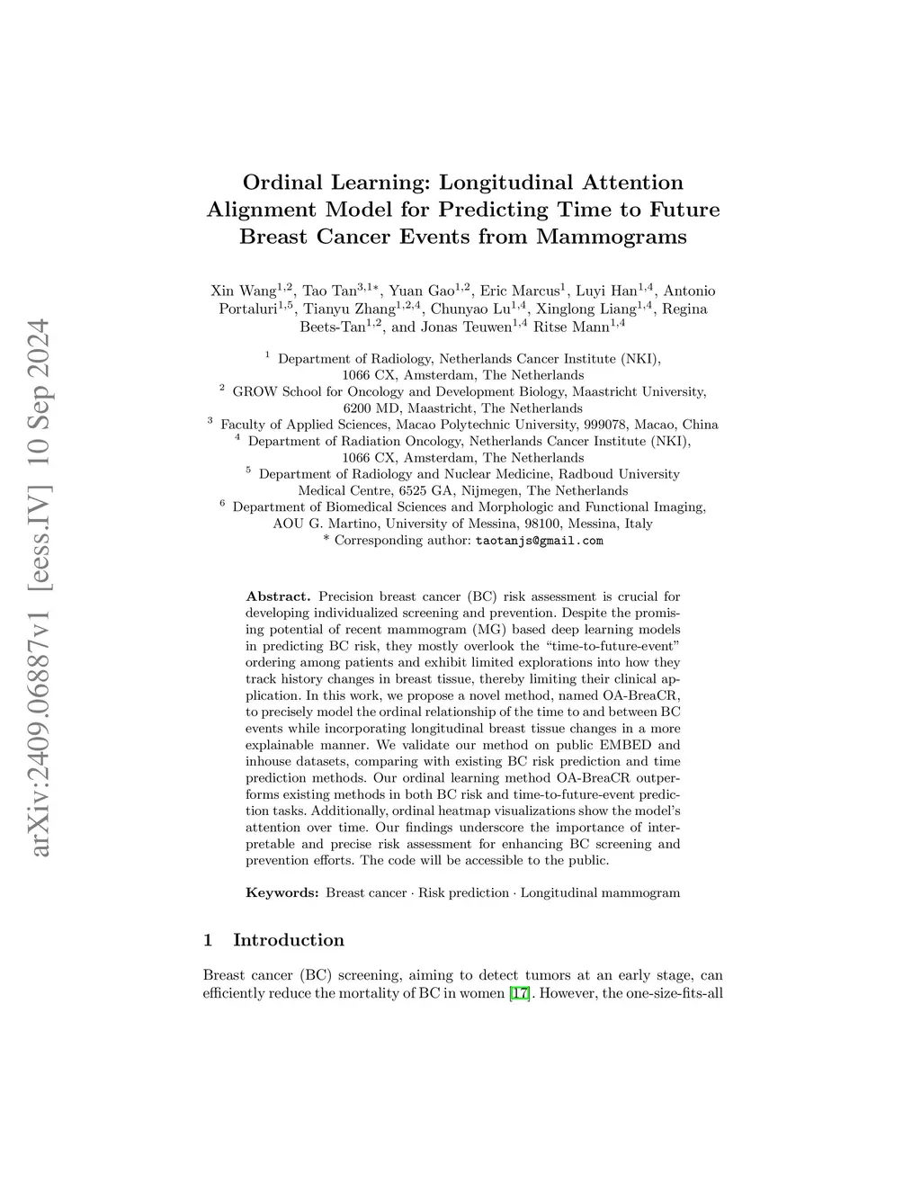 Precision breast cancer (BC) risk assessment is crucial for developing individualized screening and prevention. Despite the promising potential of recent mammogram (MG) based deep learning models in predicting BC risk, they mostly overlook the 'time-to-future-event' ordering among patients and exhibit limited explorations into how they track history changes in breast tissue, thereby limiting their clinical application. In this work, we propose a novel method, named OA-BreaCR, to precisely model the ordinal relationship of the time to and between BC events while incorporating longitudinal breast tissue changes in a more explainable manner. We validate our method on public EMBED and inhouse datasets, comparing with existing BC risk prediction and time prediction methods. Our ordinal learning method OA-BreaCR outperforms existing methods in both BC risk and time-to-future-event prediction tasks. Additionally, ordinal heatmap visualizations show the model's attention over time. Our findings underscore the importance of interpretable and precise risk assessment for enhancing BC screening and prevention efforts. The code will be accessible to the public.
