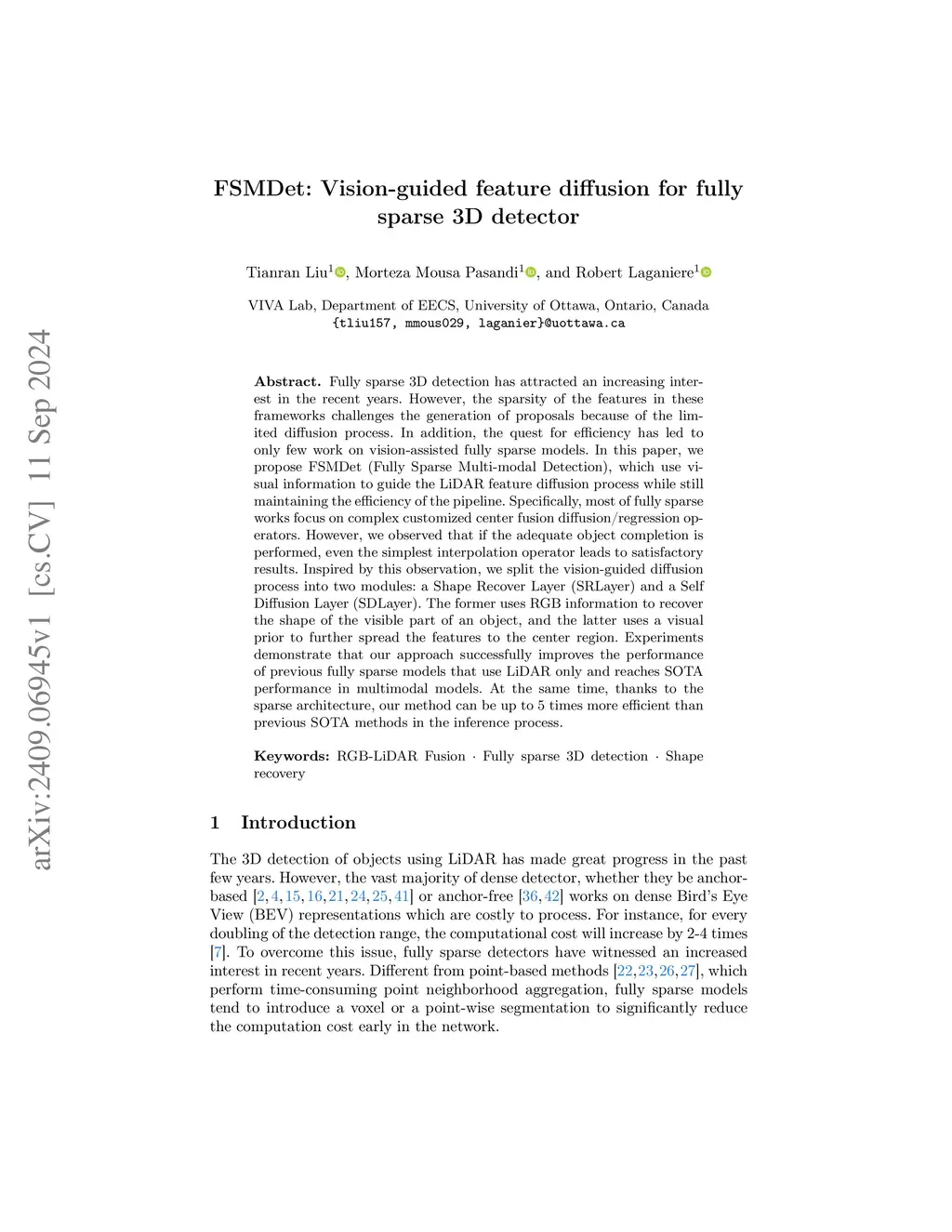 Fully sparse 3D detection has attracted an increasing interest in the recent years. However, the sparsity of the features in these frameworks challenges the generation of proposals because of the limited diffusion process. In addition, the quest for efficiency has led to only few work on vision-assisted fully sparse models. In this paper, we propose FSMDet (Fully Sparse Multi-modal Detection), which use visual information to guide the LiDAR feature diffusion process while still maintaining the efficiency of the pipeline. Specifically, most of fully sparse works focus on complex customized center fusion diffusion/regression operators. However, we observed that if the adequate object completion is performed, even the simplest interpolation operator leads to satisfactory results. Inspired by this observation, we split the vision-guided diffusion process into two modules: a Shape Recover Layer (SRLayer) and a Self Diffusion Layer (SDLayer). The former uses RGB information to recover the shape of the visible part of an object, and the latter uses a visual prior to further spread the features to the center region. Experiments demonstrate that our approach successfully improves the performance of previous fully sparse models that use LiDAR only and reaches SOTA performance in multimodal models. At the same time, thanks to the sparse architecture, our method can be up to 5 times more efficient than previous SOTA methods in the inference process.