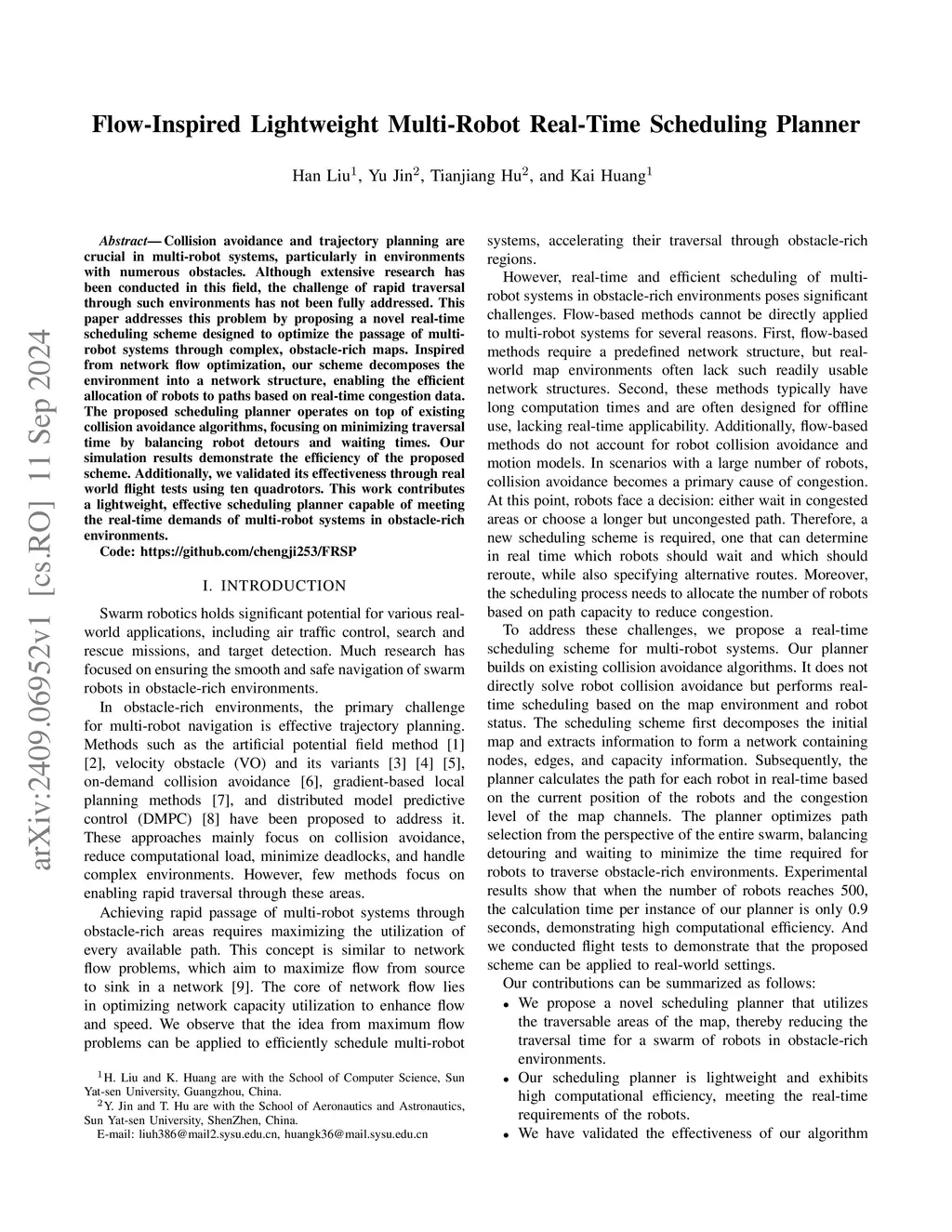 Trajectory planning is crucial in multi-robot systems, particularly in environments with numerous obstacles. While extensive research has been conducted in this field, the challenge of coordinating multiple robots to flow collectively from one side of the map to the other-such as in crossing missions through obstacle-rich spaces-has received limited attention. This paper focuses on this directional traversal scenario by introducing a real-time scheduling scheme that enables multi-robot systems to move from edge to edge, emulating the smooth and efficient flow of water. Inspired by network flow optimization, our scheme decomposes the environment into a flow-based network structure, enabling the efficient allocation of robots to paths based on real-time congestion levels. The proposed scheduling planner operates on top of existing collision avoidance algorithms, aiming to minimize overall traversal time by balancing detours and waiting times. Simulation results demonstrate the effectiveness of the proposed scheme in achieving fast and coordinated traversal. Furthermore, real-world flight tests with ten drones validate its practical feasibility. This work contributes a flow-inspired, real-time scheduling planner tailored for directional multi-robot traversal in complex, obstacle-rich environments.Code:this https URL