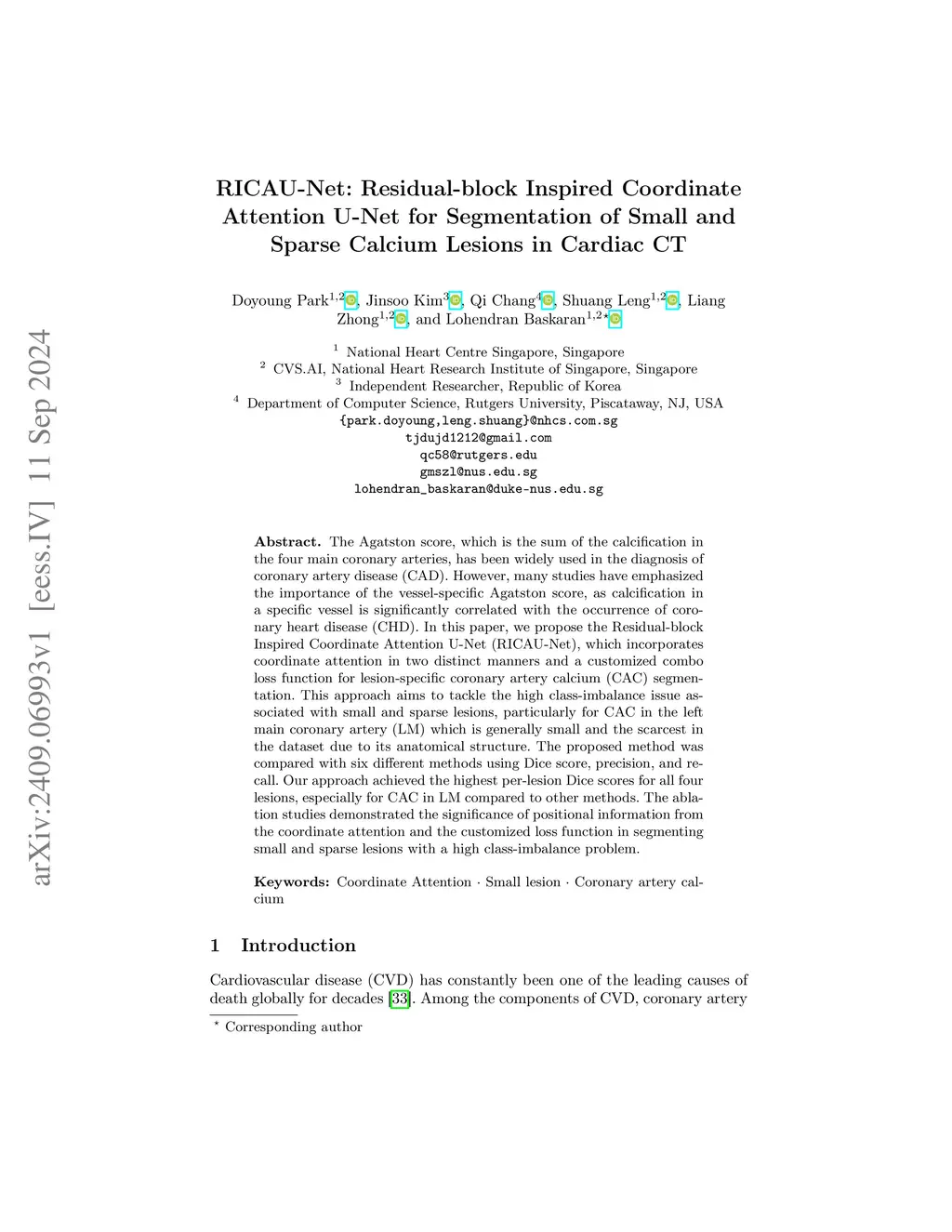 RICAU-Net: Residual-block Inspired Coordinate Attention U-Net for Segmentation of Small and Sparse Calcium Lesions in Cardiac CT