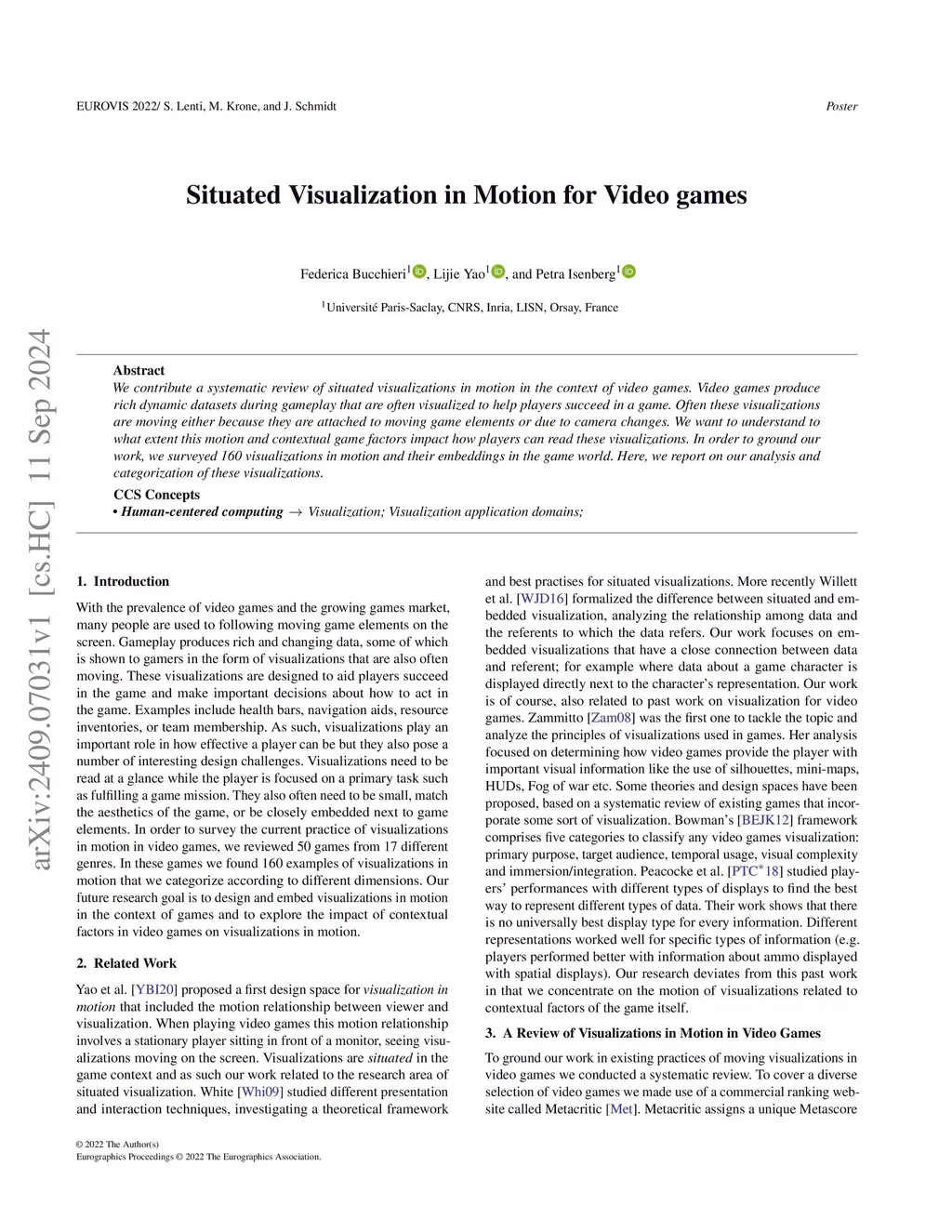 We contribute a systematic review of situated visualizations in motion in the context of video games. Video games produce rich dynamic datasets during gameplay that are often visualized to help players succeed in a game. Often these visualizations are moving either because they are attached to moving game elements or due to camera changes. We want to understand to what extent this motion and contextual game factors impact how players can read these visualizations. In order to ground our work, we surveyed 160 visualizations in motion and their embeddings in the game world. Here, we report on our analysis and categorization of these visualizations.