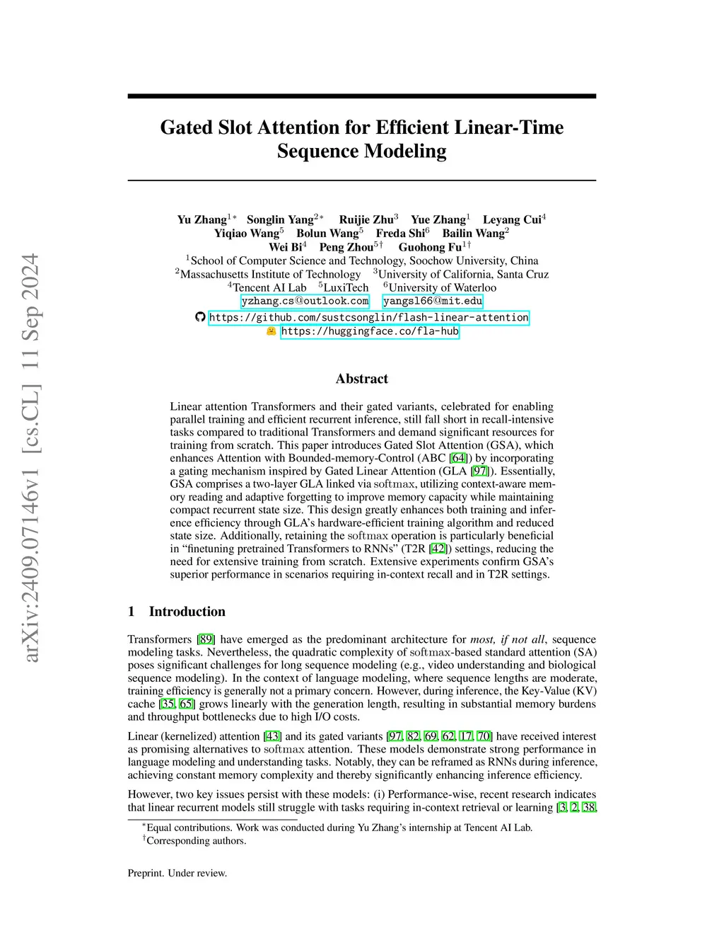 Linear attention Transformers and their gated variants, celebrated for enabling parallel training and efficient recurrent inference, still fall short in recall-intensive tasks compared to traditional Transformers and demand significant resources for training from scratch. This paper introduces Gated Slot Attention (GSA), which enhances Attention with Bounded-memory-Control (ABC) by incorporating a gating mechanism inspired by Gated Linear Attention (GLA). Essentially, GSA comprises a two-layer GLA linked via , utilizing context-aware memory reading and adaptive forgetting to improve memory capacity while maintaining compact recurrent state size. This design greatly enhances both training and inference efficiency through GLA's hardware-efficient training algorithm and reduced state size. Additionally, retaining the operation is particularly beneficial in "finetuning pretrained Transformers to RNNs" (T2R) settings, reducing the need for extensive training from scratch. Extensive experiments confirm GSA's superior performance in scenarios requiring in-context recall and in T2R settings.