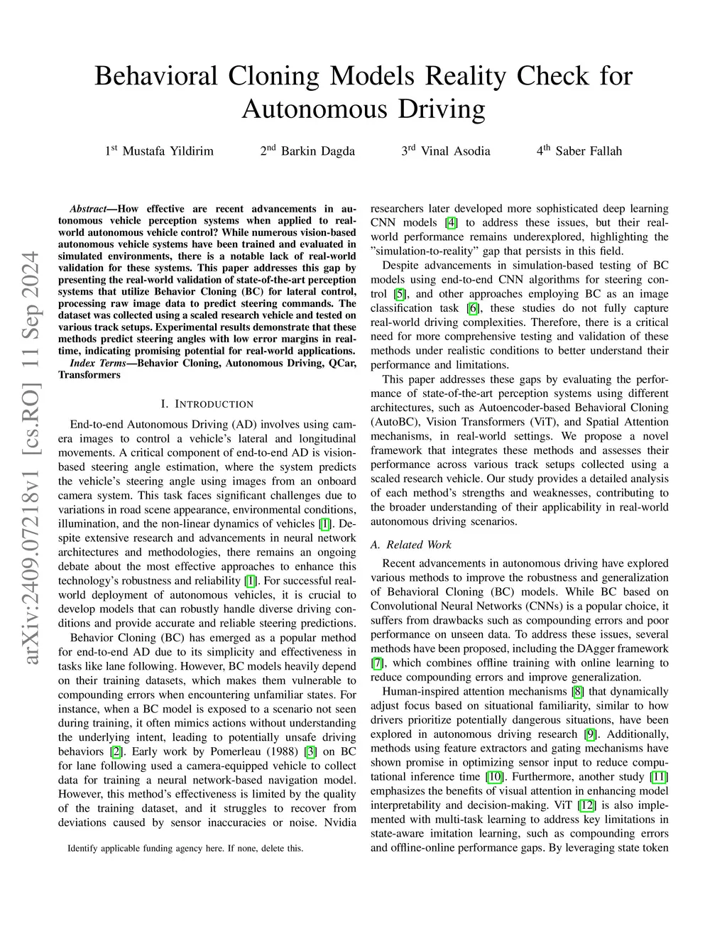 How effective are recent advancements in autonomous vehicle perception systems when applied to real-world autonomous vehicle control? While numerous vision-based autonomous vehicle systems have been trained and evaluated in simulated environments, there is a notable lack of real-world validation for these systems. This paper addresses this gap by presenting the real-world validation of state-of-the-art perception systems that utilize Behavior Cloning (BC) for lateral control, processing raw image data to predict steering commands. The dataset was collected using a scaled research vehicle and tested on various track setups. Experimental results demonstrate that these methods predict steering angles with low error margins in real-time, indicating promising potential for real-world applications.