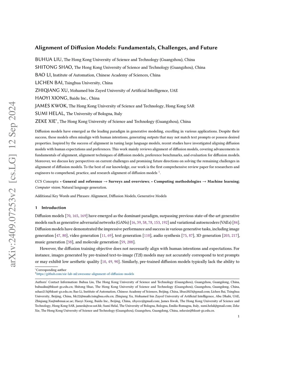 Diffusion models have emerged as the leading paradigm in generative modeling, excelling in various applications. Despite their success, these models often misalign with human intentions and generate results with undesired properties or even harmful content. Inspired by the success and popularity of alignment in tuning large language models, recent studies have investigated aligning diffusion models with human expectations and preferences. This work mainly reviews alignment of diffusion models, covering advancements in fundamentals of alignment, alignment techniques of diffusion models, preference benchmarks, and evaluation for diffusion models. Moreover, we discuss key perspectives on current challenges and promising future directions on solving the remaining challenges in alignment of diffusion models. To the best of our knowledge, our work is the first comprehensive review paper for researchers and engineers to comprehend, practice, and research alignment of diffusion models.