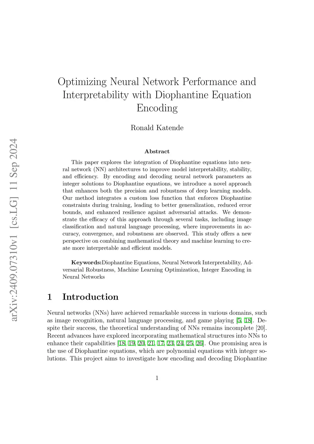 This paper explores the integration of Diophantine equations into neural network (NN) architectures to improve model interpretability, stability, and efficiency. By encoding and decoding neural network parameters as integer solutions to Diophantine equations, we introduce a novel approach that enhances both the precision and robustness of deep learning models. Our method integrates a custom loss function that enforces Diophantine constraints during training, leading to better generalization, reduced error bounds, and enhanced resilience against adversarial attacks. We demonstrate the efficacy of this approach through several tasks, including image classification and natural language processing, where improvements in accuracy, convergence, and robustness are observed. This study offers a new perspective on combining mathematical theory and machine learning to create more interpretable and efficient models.