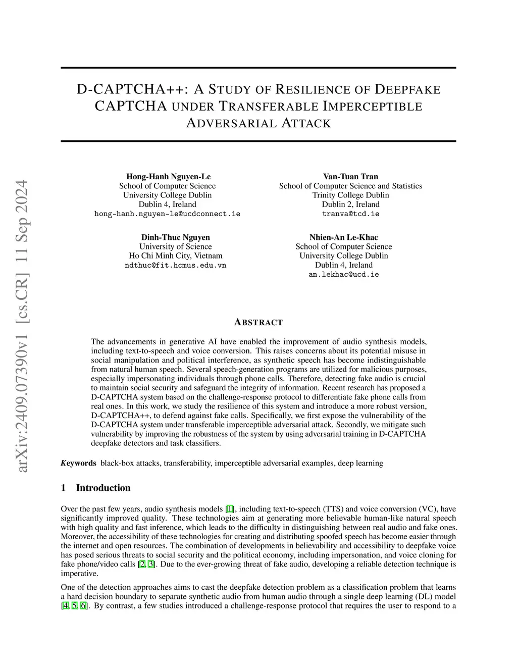 The advancements in generative AI have enabled the improvement of audio synthesis models, including text-to-speech and voice conversion. This raises concerns about its potential misuse in social manipulation and political interference, as synthetic speech has become indistinguishable from natural human speech. Several speech-generation programs are utilized for malicious purposes, especially impersonating individuals through phone calls. Therefore, detecting fake audio is crucial to maintain social security and safeguard the integrity of information. Recent research has proposed a D-CAPTCHA system based on the challenge-response protocol to differentiate fake phone calls from real ones. In this work, we study the resilience of this system and introduce a more robust version, D-CAPTCHA++, to defend against fake calls. Specifically, we first expose the vulnerability of the D-CAPTCHA system under transferable imperceptible adversarial attack. Secondly, we mitigate such vulnerability by improving the robustness of the system by using adversarial training in D-CAPTCHA deepfake detectors and task classifiers.