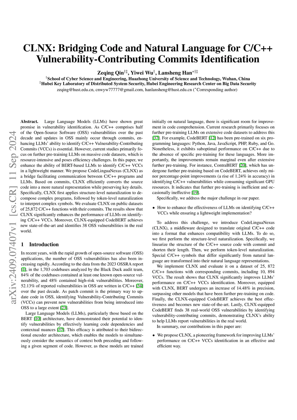 Large Language Models (LLMs) have shown great promise in vulnerability identification. As C/C++ comprises half of the Open-Source Software (OSS) vulnerabilities over the past decade and updates in OSS mainly occur through commits, enhancing LLMs' ability to identify C/C++ Vulnerability-Contributing Commits (VCCs) is essential. However, current studies primarily focus on further pre-training LLMs on massive code datasets, which is resource-intensive and poses efficiency challenges. In this paper, we enhance the ability of BERT-based LLMs to identify C/C++ VCCs in a lightweight manner. We propose CodeLinguaNexus (CLNX) as a bridge facilitating communication between C/C++ programs and LLMs. Based on commits, CLNX efficiently converts the source code into a more natural representation while preserving key details. Specifically, CLNX first applies structure-level naturalization to decompose complex programs, followed by token-level naturalization to interpret complex symbols. We evaluate CLNX on public datasets of 25,872 C/C++ functions with their commits. The results show that CLNX significantly enhances the performance of LLMs on identifying C/C++ VCCs. Moreover, CLNX-equipped CodeBERT achieves new state-of-the-art and identifies 38 OSS vulnerabilities in the real world.