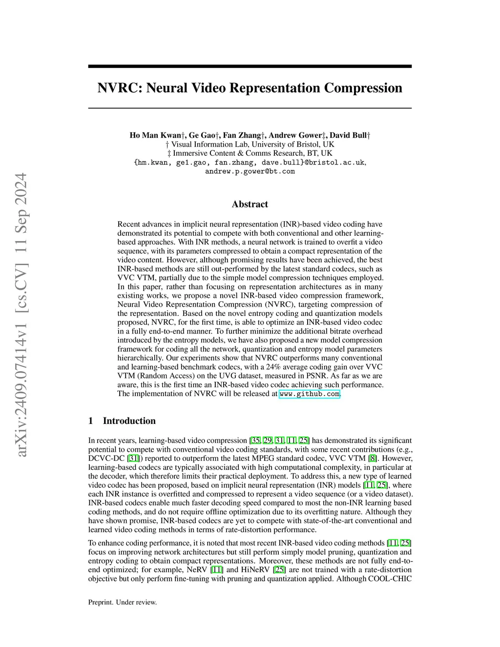 Recent advances in implicit neural representation (INR)-based video coding have demonstrated its potential to compete with both conventional and other learning-based approaches. With INR methods, a neural network is trained to overfit a video sequence, with its parameters compressed to obtain a compact representation of the video content. However, although promising results have been achieved, the best INR-based methods are still out-performed by the latest standard codecs, such as VVC VTM, partially due to the simple model compression techniques employed. In this paper, rather than focusing on representation architectures as in many existing works, we propose a novel INR-based video compression framework, Neural Video Representation Compression (NVRC), targeting compression of the representation. Based on the novel entropy coding and quantization models proposed, NVRC, for the first time, is able to optimize an INR-based video codec in a fully end-to-end manner. To further minimize the additional bitrate overhead introduced by the entropy models, we have also proposed a new model compression framework for coding all the network, quantization and entropy model parameters hierarchically. Our experiments show that NVRC outperforms many conventional and learning-based benchmark codecs, with a 24% average coding gain over VVC VTM (Random Access) on the UVG dataset, measured in PSNR. As far as we are aware, this is the first time an INR-based video codec achieving such performance. The implementation of NVRC will be released.