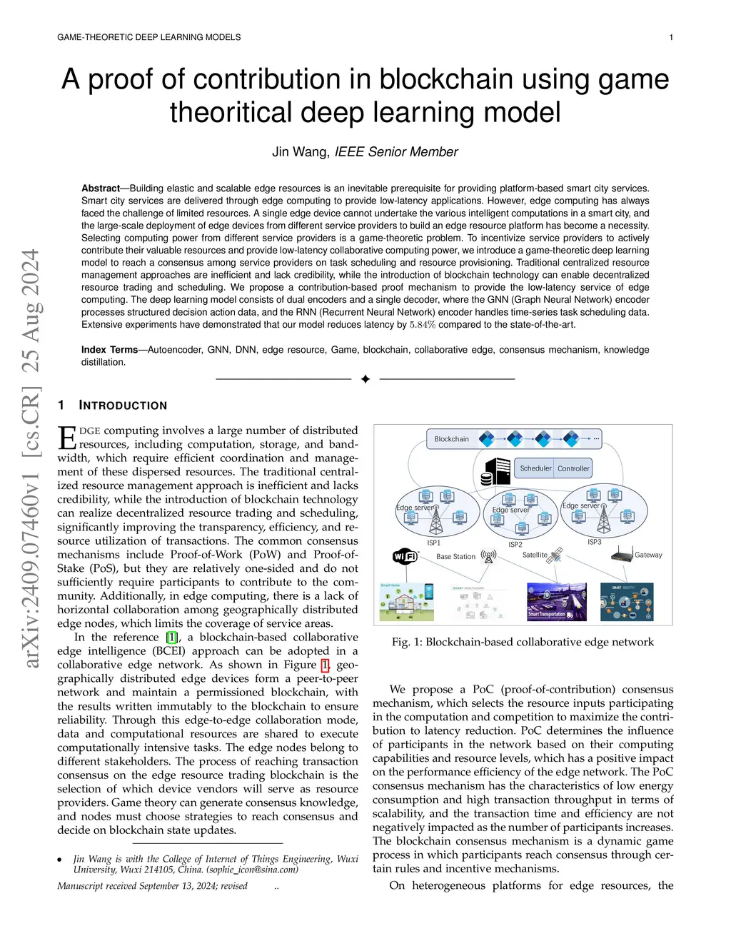Building elastic and scalable edge resources is an inevitable prerequisite for providing platform-based smart city services. Smart city services are delivered through edge computing to provide low-latency applications. However, edge computing has always faced the challenge of limited resources. A single edge device cannot undertake the various intelligent computations in a smart city, and the large-scale deployment of edge devices from different service providers to build an edge resource platform has become a necessity. Selecting computing power from different service providers is a game-theoretic problem. To incentivize service providers to actively contribute their valuable resources and provide low-latency collaborative computing power, we introduce a game-theoretic deep learning model to reach a consensus among service providers on task scheduling and resource provisioning. Traditional centralized resource management approaches are inefficient and lack credibility, while the introduction of blockchain technology can enable decentralized resource trading and scheduling. We propose a contribution-based proof mechanism to provide the low-latency service of edge computing. The deep learning model consists of dual encoders and a single decoder, where the GNN (Graph Neural Network) encoder processes structured decision action data, and the RNN (Recurrent Neural Network) encoder handles time-series task scheduling data. Extensive experiments have demonstrated that our model reduces latency by 584% compared to the state-of-the-art.