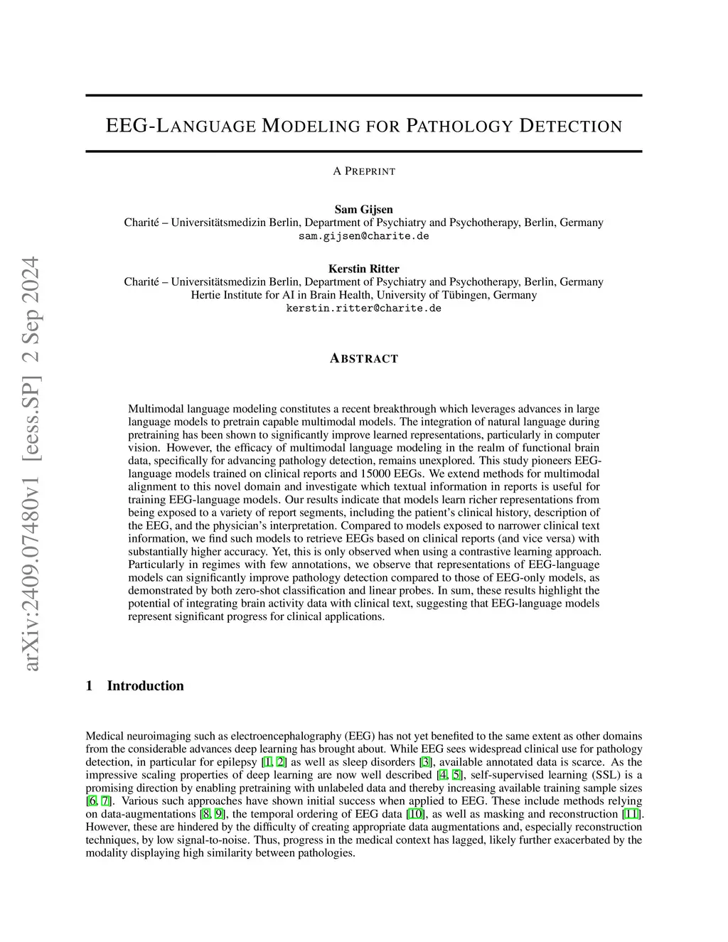 Multimodal language modeling has enabled breakthroughs for representation learning, yet remains unexplored in the realm of functional brain data for clinical phenotyping. This paper pioneers EEG-language models (ELMs) trained on clinical reports and 15000 EEGs. We propose to combine multimodal alignment in this novel domain with timeseries cropping and text segmentation, enabling an extension based on multiple instance learning to alleviate misalignment between irrelevant EEG or text segments. Our multimodal models significantly improve over EEG-only models across four clinical evaluations and for the first time enable zero-shot classification as well as retrieval of both neural signals and reports. In sum, these results highlight the potential of ELMs, representing significant progress for clinical applications.