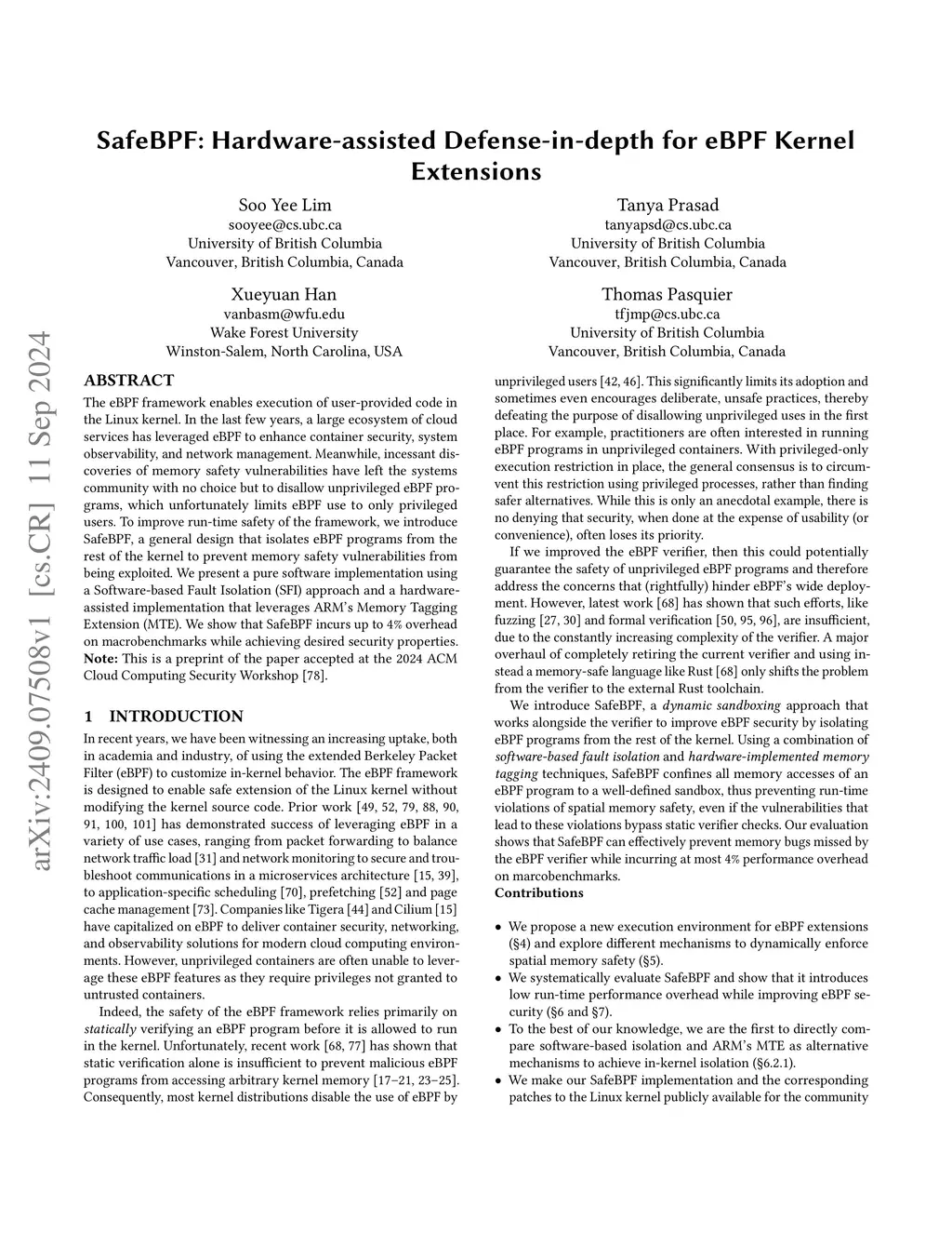 SafeBPF: Hardware-assisted Defense-in-depth for eBPF Kernel Extensions