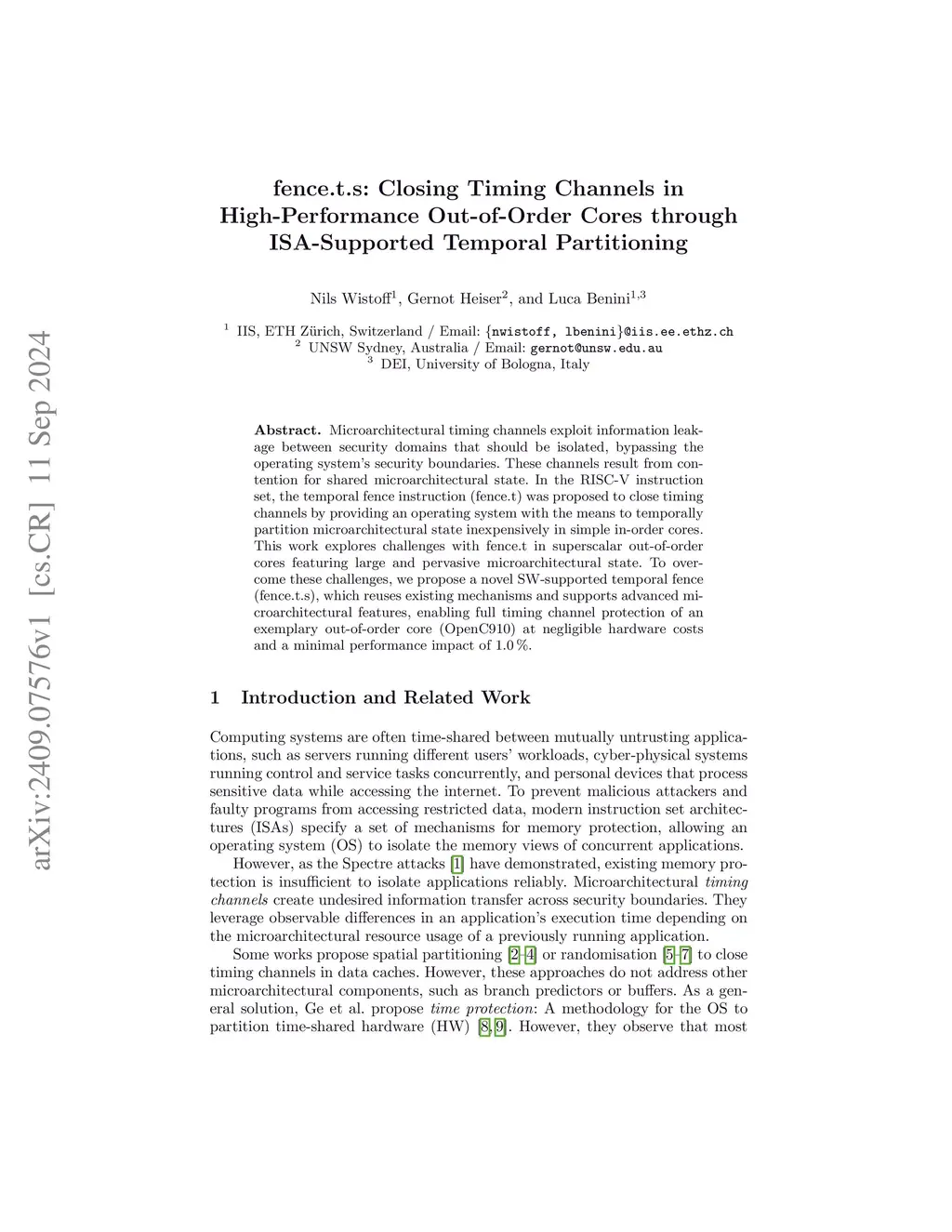 Microarchitectural timing channels exploit information leakage between security domains that should be isolated, bypassing the operating system's security boundaries. These channels result from contention for shared microarchitectural state. In the RISC-V instruction set, the temporal fence instruction (fence.t) was proposed to close timing channels by providing an operating system with the means to temporally partition microarchitectural state inexpensively in simple in-order cores. This work explores challenges with fence.t in superscalar out-of-order cores featuring large and pervasive microarchitectural state. To overcome these challenges, we propose a novel SW-supported temporal fence (fence.t.s), which reuses existing mechanisms and supports advanced microarchitectural features, enabling full timing channel protection of an exemplary out-of-order core (OpenC910) at negligible hardware costs and a minimal performance impact of 1.0 %.