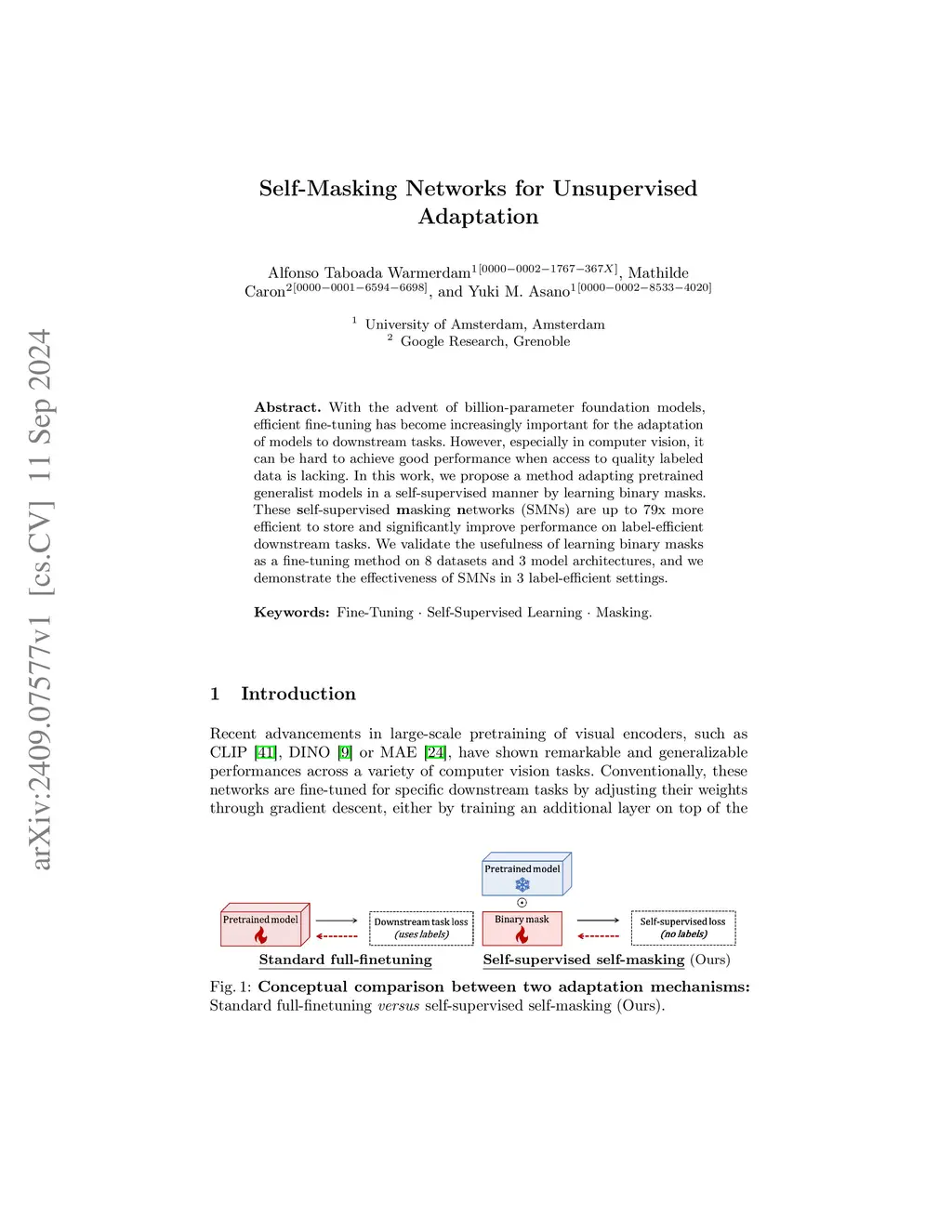 With the advent of billion-parameter foundation models, efficient fine-tuning has become increasingly important for the adaptation of models to downstream tasks. However, especially in computer vision, it can be hard to achieve good performance when access to quality labeled data is lacking. In this work, we propose a method adapting pretrained generalist models in a self-supervised manner by learning binary masks. These self-supervised masking networks (SMNs) are up to 79x more efficient to store and significantly improve performance on label-efficient downstream tasks. We validate the usefulness of learning binary masks as a fine-tuning method on 8 datasets and 3 model architectures, and we demonstrate the effectiveness of SMNs in 3 label-efficient settings.