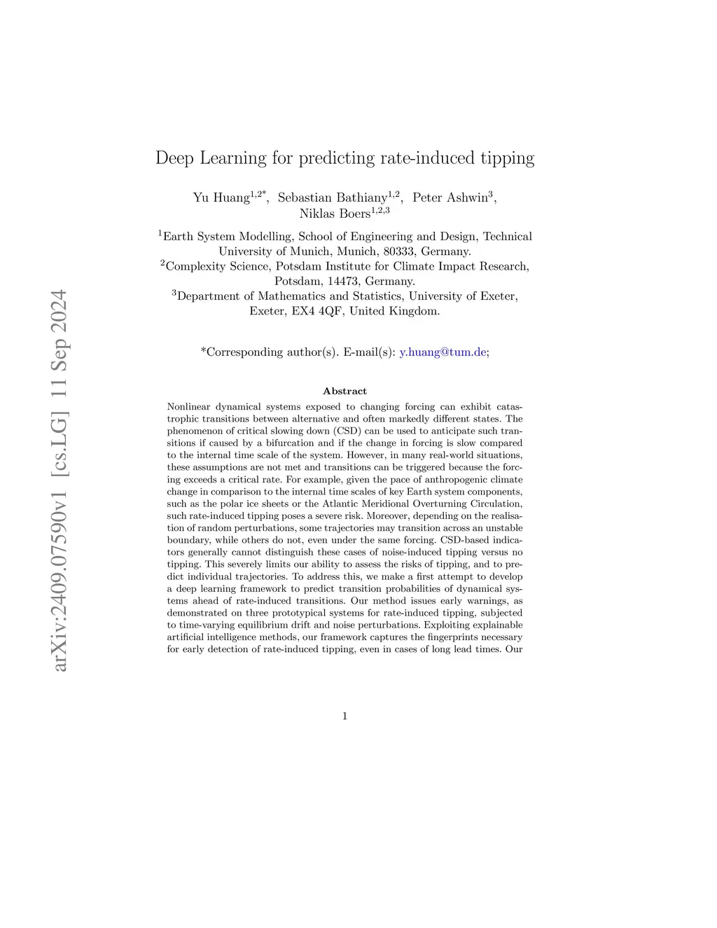 Nonlinear dynamical systems exposed to changing forcing can exhibit catastrophic transitions between alternative and often markedly different states. The phenomenon of critical slowing down (CSD) can be used to anticipate such transitions if caused by a bifurcation and if the change in forcing is slow compared to the internal time scale of the system. However, in many real-world situations, these assumptions are not met and transitions can be triggered because the forcing exceeds a critical rate. For example, given the pace of anthropogenic climate change in comparison to the internal time scales of key Earth system components, such as the polar ice sheets or the Atlantic Meridional Overturning Circulation, such rate-induced tipping poses a severe risk. Moreover, depending on the realisation of random perturbations, some trajectories may transition across an unstable boundary, while others do not, even under the same forcing. CSD-based indicators generally cannot distinguish these cases of noise-induced tipping versus no tipping. This severely limits our ability to assess the risks of tipping, and to predict individual trajectories. To address this, we make a first attempt to develop a deep learning framework to predict transition probabilities of dynamical systems ahead of rate-induced transitions. Our method issues early warnings, as demonstrated on three prototypical systems for rate-induced tipping, subjected to time-varying equilibrium drift and noise perturbations. Exploiting explainable artificial intelligence methods, our framework captures the fingerprints necessary for early detection of rate-induced tipping, even in cases of long lead times. Our findings demonstrate the predictability of rate-induced and noise-induced tipping, advancing our ability to determine safe operating spaces for a broader class of dynamical systems than possible so far.