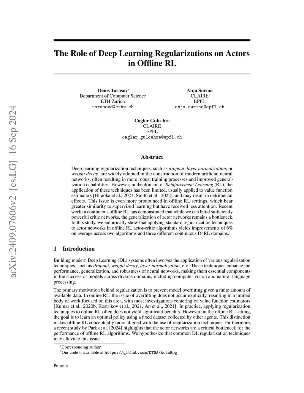 The Role of Deep Learning Regularizations on Actors in Offline RL