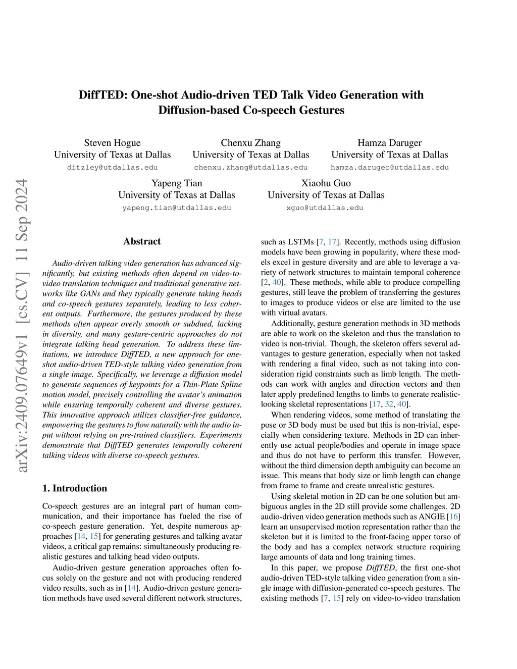 Audio-driven talking video generation has advanced significantly, but existing methods often depend on video-to-video translation techniques and traditional generative networks like GANs and they typically generate taking heads and co-speech gestures separately, leading to less coherent outputs. Furthermore, the gestures produced by these methods often appear overly smooth or subdued, lacking in diversity, and many gesture-centric approaches do not integrate talking head generation. To address these limitations, we introduce DiffTED, a new approach for one-shot audio-driven TED-style talking video generation from a single image. Specifically, we leverage a diffusion model to generate sequences of keypoints for a Thin-Plate Spline motion model, precisely controlling the avatar's animation while ensuring temporally coherent and diverse gestures. This innovative approach utilizes classifier-free guidance, empowering the gestures to flow naturally with the audio input without relying on pre-trained classifiers. Experiments demonstrate that DiffTED generates temporally coherent talking videos with diverse co-speech gestures.