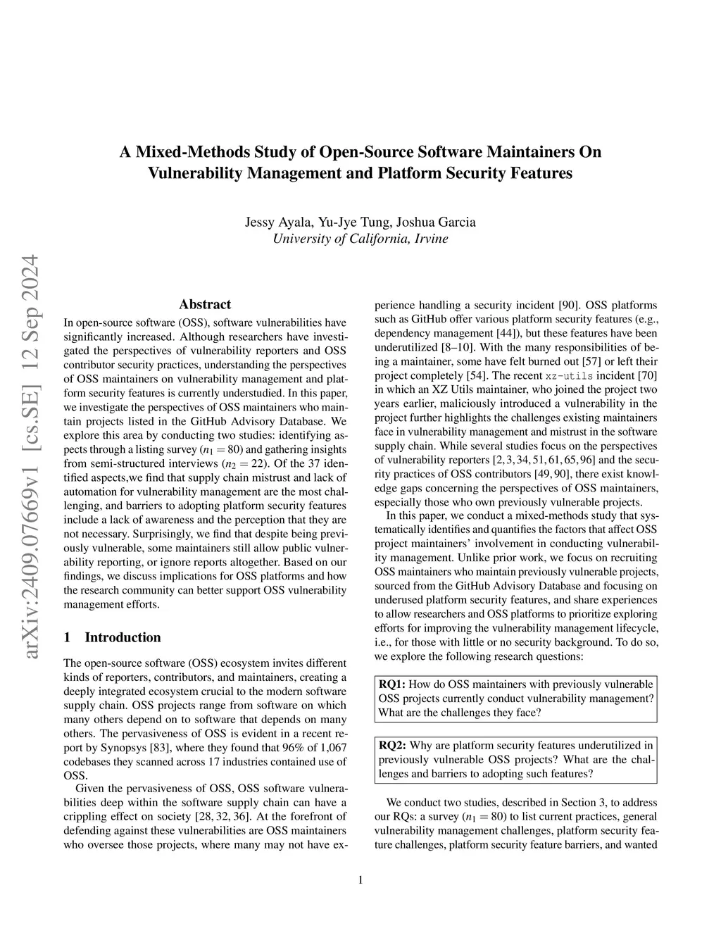 A Mixed-Methods Study of Open-Source Software Maintainers On Vulnerability Management and Platform Security Features