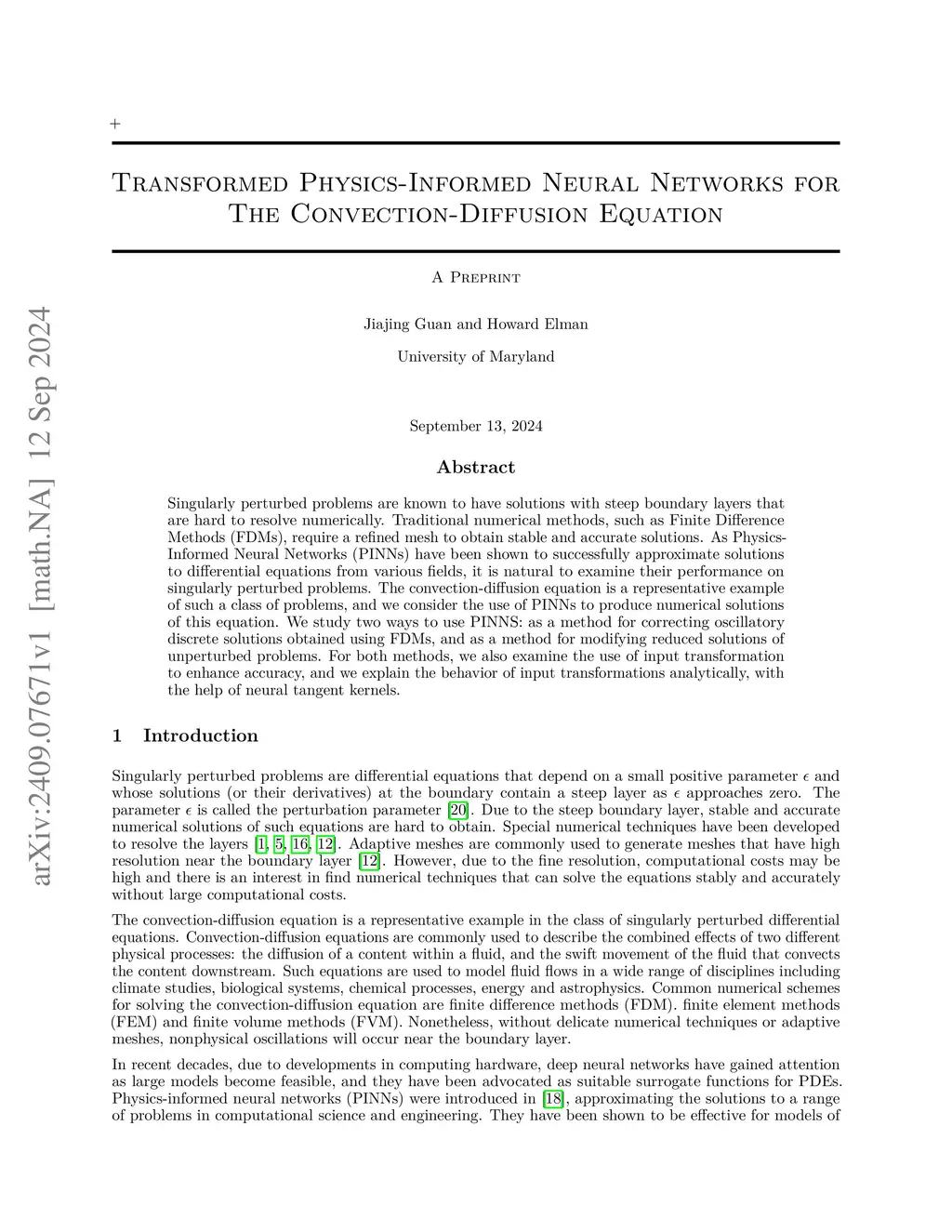 Singularly perturbed problems are known to have solutions with steep boundary layers that are hard to resolve numerically. Traditional numerical methods, such as Finite Difference Methods (FDMs), require a refined mesh to obtain stable and accurate solutions. As Physics-Informed Neural Networks (PINNs) have been shown to successfully approximate solutions to differential equations from various fields, it is natural to examine their performance on singularly perturbed problems. The convection-diffusion equation is a representative example of such a class of problems, and we consider the use of PINNs to produce numerical solutions of this equation. We study two ways to use PINNS: as a method for correcting oscillatory discrete solutions obtained using FDMs, and as a method for modifying reduced solutions of unperturbed problems. For both methods, we also examine the use of input transformation to enhance accuracy, and we explain the behavior of input transformations analytically, with the help of neural tangent kernels.