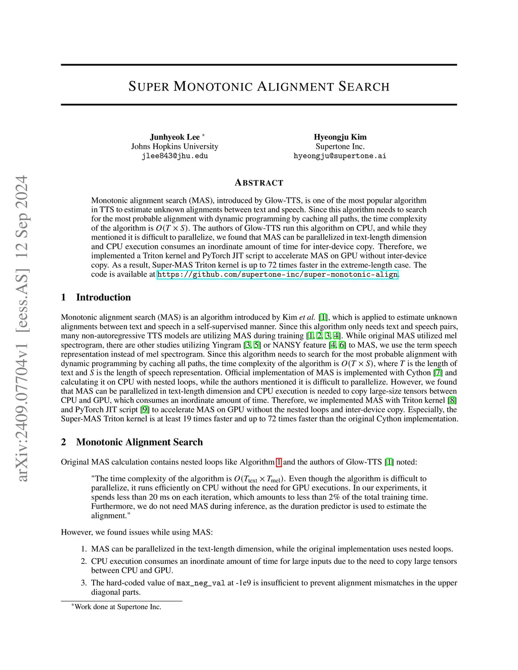 Monotonic alignment search (MAS), introduced by Glow-TTS, is one of the most popular algorithm in text-to-speech to estimate unknown alignments between text and speech. Since this algorithm needs to search for the most probable alignment with dynamic programming by caching all possible paths, the time complexity of the algorithm is , where is the length of text and is the length of speech representation. The authors of Glow-TTS run this algorithm on CPU, and while they mentioned it is difficult to parallelize, we found that MAS can be parallelized in text length dimension and CPU execution consumes an inordinate amount of time for inter-device copy. Therefore, we implemented a Triton kernel and PyTorch JIT script to accelerate MAS on GPU without inter-device copy. As a result, Super-MAS Triton kernel is up to 72 times faster in the extreme-length case. The code is available atthis https URL.