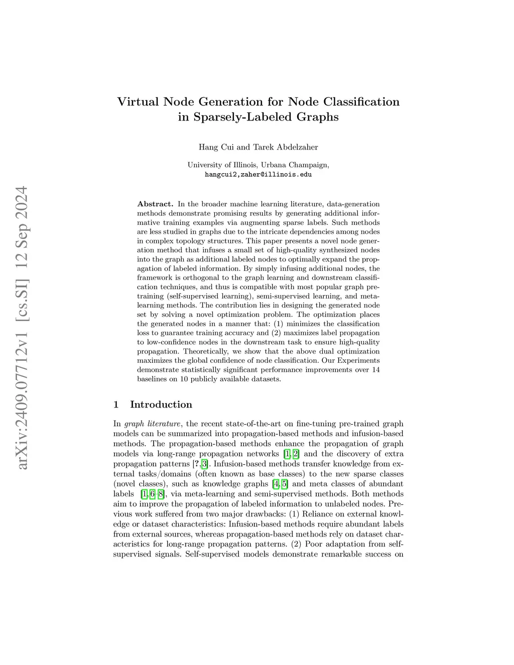 In the broader machine learning literature, data-generation methods demonstrate promising results by generating additional informative training examples via augmenting sparse labels. Such methods are less studied in graphs due to the intricate dependencies among nodes in complex topology structures. This paper presents a novel node generation method that infuses a small set of high-quality synthesized nodes into the graph as additional labeled nodes to optimally expand the propagation of labeled information. By simply infusing additional nodes, the framework is orthogonal to the graph learning and downstream classification techniques, and thus is compatible with most popular graph pre-training (self-supervised learning), semi-supervised learning, and meta-learning methods. The contribution lies in designing the generated node set by solving a novel optimization problem. The optimization places the generated nodes in a manner that: (1) minimizes the classification loss to guarantee training accuracy and (2) maximizes label propagation to low-confidence nodes in the downstream task to ensure high-quality propagation. Theoretically, we show that the above dual optimization maximizes the global confidence of node classification. Our Experiments demonstrate statistically significant performance improvements over 14 baselines on 10 publicly available datasets.