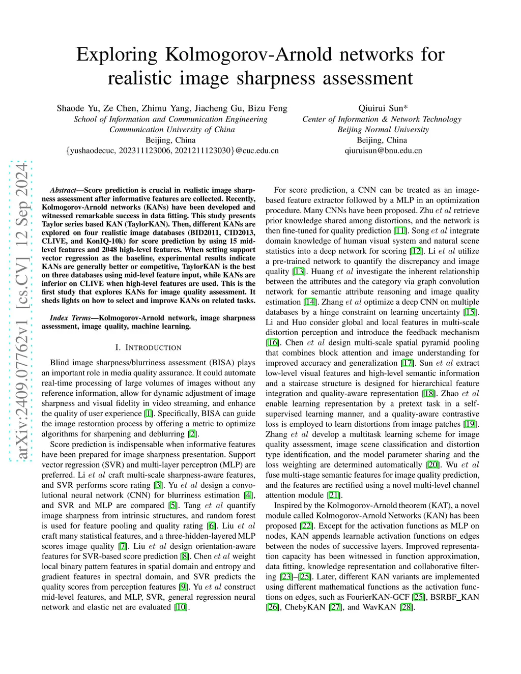 Exploring Kolmogorov-Arnold networks for realistic image sharpness assessment