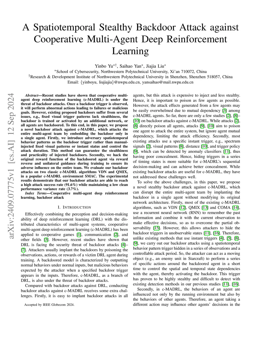 A Spatiotemporal Stealthy Backdoor Attack against Cooperative