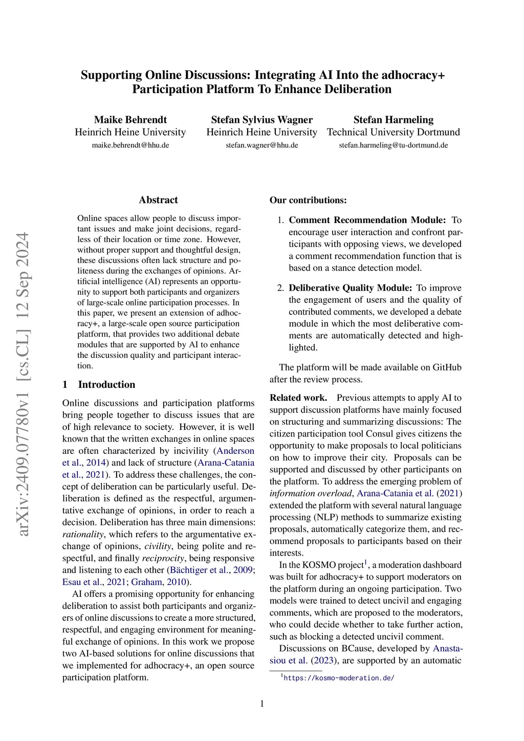 Supporting Online Discussions: Integrating AI Into the adhocracy+ Participation Platform To Enhance Deliberation