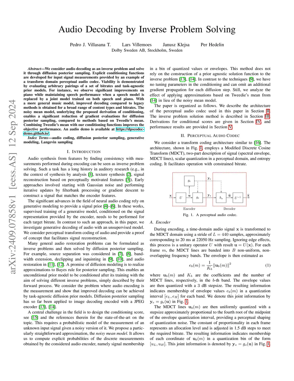 We consider audio decoding as an inverse problem and solve it through diffusion posterior sampling. Explicit conditioning functions are developed for input signal measurements provided by an example of a transform domain perceptual audio codec. Viability is demonstrated by evaluating arbitrary pairings of a set of bitrates and task-agnostic prior models. For instance, we observe significant improvements on piano while maintaining speech performance when a speech model is replaced by a joint model trained on both speech and piano. With a more general music model, improved decoding compared to legacy methods is obtained for a broad range of content types and bitrates. The noisy mean model, underlying the proposed derivation of conditioning, enables a significant reduction of gradient evaluations for diffusion posterior sampling, compared to methods based on Tweedie's mean. Combining Tweedie's mean with our conditioning functions improves the objective performance. An audio demo is available at https://dpscodec-demo.github.io/.