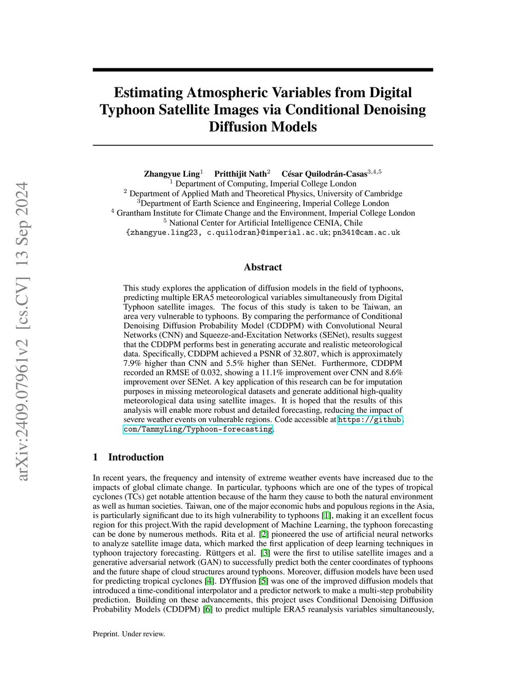 This study explores the application of diffusion models in the field of typhoons, predicting multiple ERA5 meteorological variables simultaneously from Digital Typhoon satellite images. The focus of this study is taken to be Taiwan, an area very vulnerable to typhoons. By comparing the performance of Conditional Denoising Diffusion Probability Model (CDDPM) with Convolutional Neural Networks (CNN) and Squeeze-and-Excitation Networks (SENet), results suggest that the CDDPM performs best in generating accurate and realistic meteorological data. Specifically, CDDPM achieved a PSNR of 32.807, which is approximately 7.9% higher than CNN and 5.5% higher than SENet. Furthermore, CDDPM recorded an RMSE of 0.032, showing a 11.1% improvement over CNN and 8.6% improvement over SENet. A key application of this research can be for imputation purposes in missing meteorological datasets and generate additional high-quality meteorological data using satellite images. It is hoped that the results of this analysis will enable more robust and detailed forecasting, reducing the impact of severe weather events on vulnerable regions. Code accessible at https://github.com/TammyLing/Typhoon-forecasting.