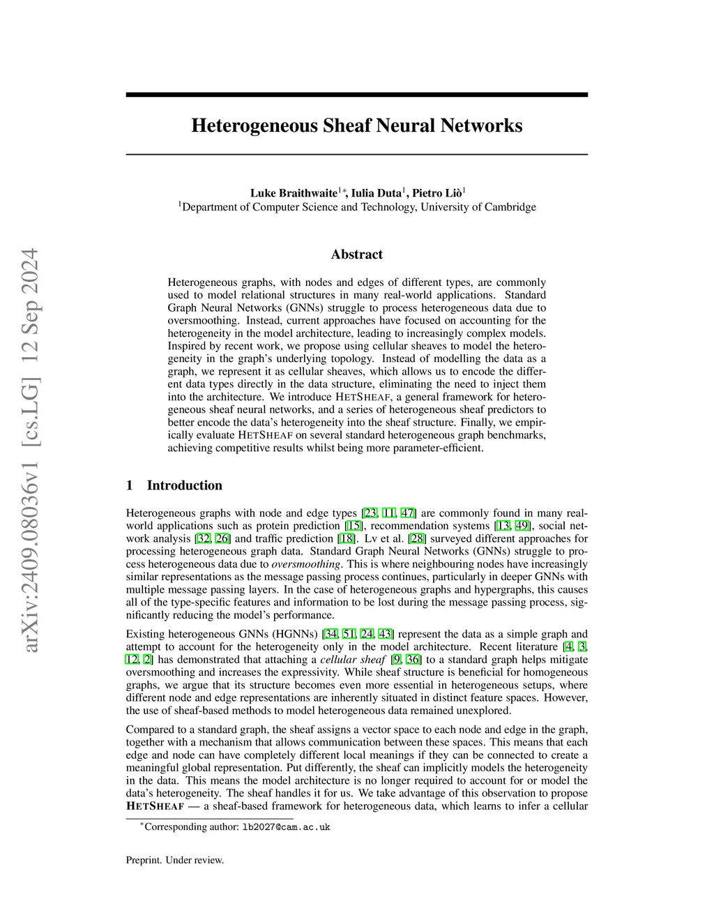 Heterogeneous graphs, with nodes and edges of different types, are commonly used to model relational structures in many real-world applications. Standard Graph Neural Networks (GNNs) struggle to process heterogeneous data due to oversmoothing. Instead, current approaches have focused on accounting for the heterogeneity in the model architecture, leading to increasingly complex models. Inspired by recent work, we propose using cellular sheaves to model the heterogeneity in the graph's underlying topology. Instead of modelling the data as a graph, we represent it as cellular sheaves, which allows us to encode the different data types directly in the data structure, eliminating the need to inject them into the architecture. We introduce HetSheaf, a general framework for heterogeneous sheaf neural networks, and a series of heterogeneous sheaf predictors to better encode the data's heterogeneity into the sheaf structure. Finally, we empirically evaluate HetSheaf on several standard heterogeneous graph benchmarks, achieving competitive results whilst being more parameter-efficient.