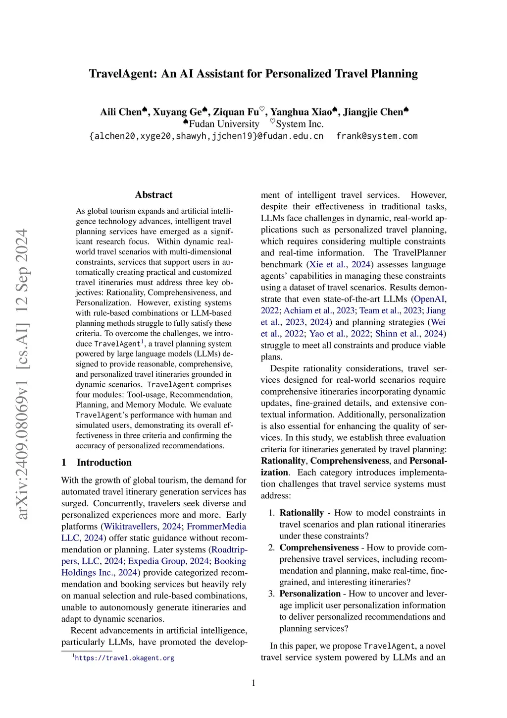 As global tourism expands and artificial intelligence technology advances, intelligent travel planning services have emerged as a significant research focus. Within dynamic real-world travel scenarios with multi-dimensional constraints, services that support users in automatically creating practical and customized travel itineraries must address three key objectives: Rationality, Comprehensiveness, and Personalization. However, existing systems with rule-based combinations or LLM-based planning methods struggle to fully satisfy these criteria. To overcome the challenges, we introduce TravelAgent, a travel planning system powered by large language models (LLMs) designed to provide reasonable, comprehensive, and personalized travel itineraries grounded in dynamic scenarios. TravelAgent comprises four modules: Tool-usage, Recommendation, Planning, and Memory Module. We evaluate TravelAgent's performance with human and simulated users, demonstrating its overall effectiveness in three criteria and confirming the accuracy of personalized recommendations.