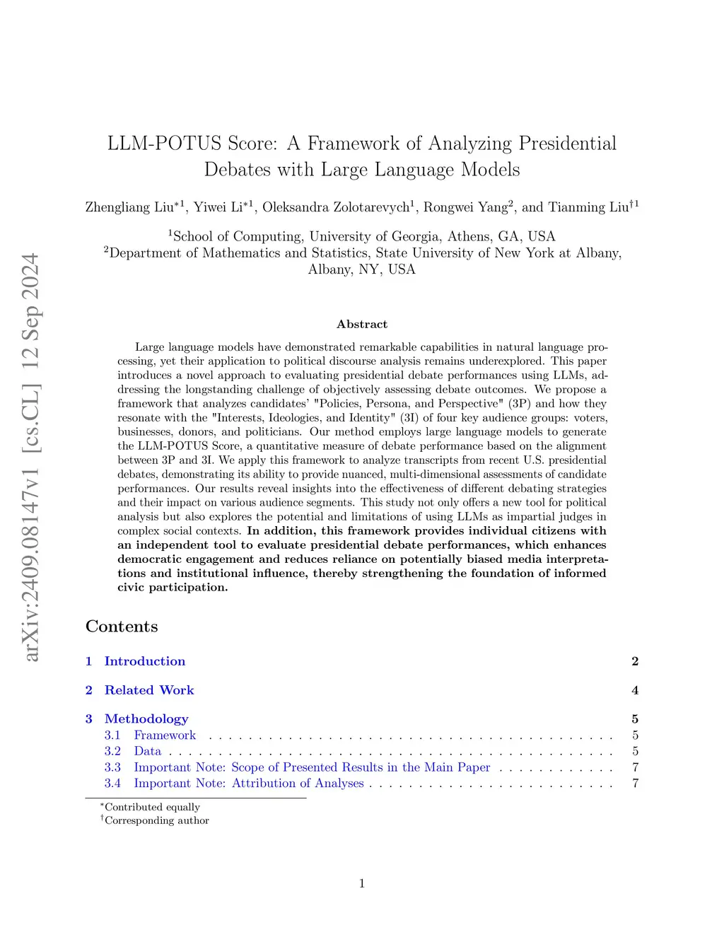 Large language models have demonstrated remarkable capabilities in natural language processing, yet their application to political discourse analysis remains underexplored. This paper introduces a novel approach to evaluating presidential debate performances using LLMs, addressing the longstanding challenge of objectively assessing debate outcomes. We propose a framework that analyzes candidates' "Policies, Persona, and Perspective" (3P) and how they resonate with the "Interests, Ideologies, and Identity" (3I) of four key audience groups: voters, businesses, donors, and politicians. Our method employs large language models to generate the LLM-POTUS Score, a quantitative measure of debate performance based on the alignment between 3P and 3I. We apply this framework to analyze transcripts from recent U.S. presidential debates, demonstrating its ability to provide nuanced, multi-dimensional assessments of candidate performances. Our results reveal insights into the effectiveness of different debating strategies and their impact on various audience segments. This study not only offers a new tool for political analysis but also explores the potential and limitations of using LLMs as impartial judges in complex social contexts. In addition, this framework provides individual citizens with an independent tool to evaluate presidential debate performances, which enhances democratic engagement and reduces reliance on potentially biased media interpretations and institutional influence, thereby strengthening the foundation of informed civic participation.
