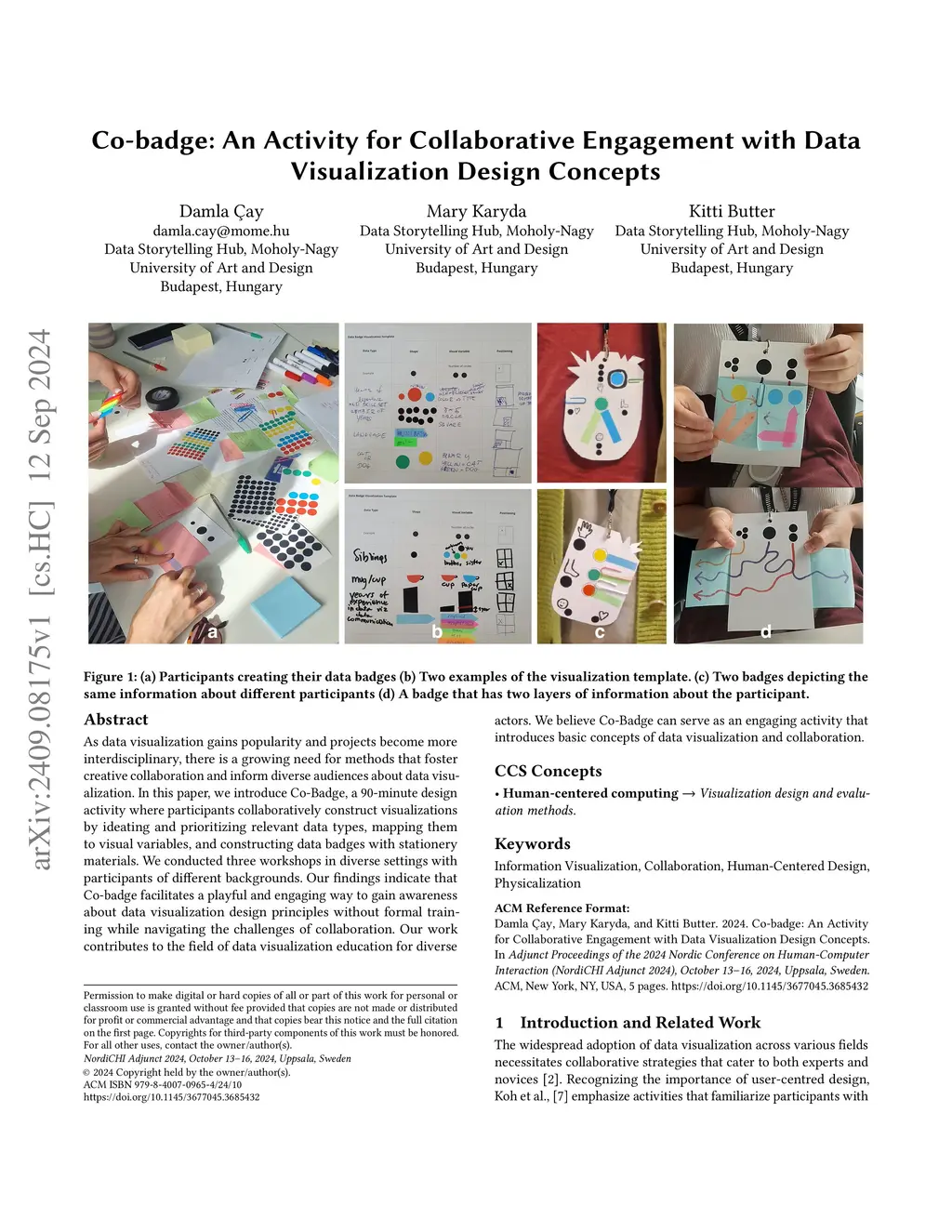 As data visualization gains popularity and projects become more interdisciplinary, there is a growing need for methods that foster creative collaboration and inform diverse audiences about data visualisation. In this paper, we introduce Co-Badge, a 90-minute design activity where participants collaboratively construct visualizations by ideating and prioritizing relevant data types, mapping them to visual variables, and constructing data badges with stationery materials. We conducted three workshops in diverse settings with participants of different backgrounds. Our findings indicate that Co-badge facilitates a playful and engaging way to gain awareness about data visualization design principles without formal training while navigating the challenges of collaboration. Our work contributes to the field of data visualization education for diverse actors. We believe Co-Badge can serve as an engaging activity that introduces basic concepts of data visualization and collaboration.