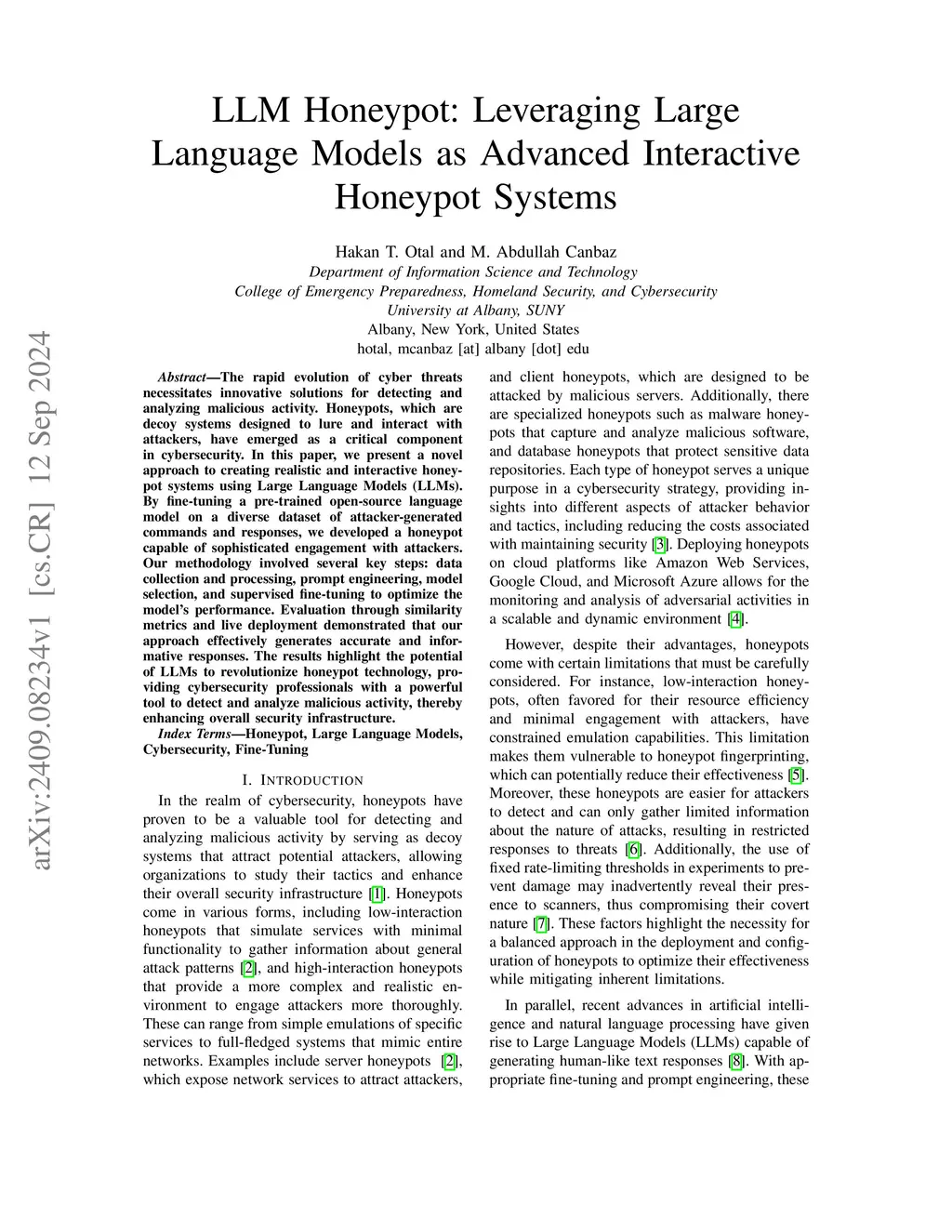 The rapid evolution of cyber threats necessitates innovative solutions for detecting and analyzing malicious activity. Honeypots, which are decoy systems designed to lure and interact with attackers, have emerged as a critical component in cybersecurity. In this paper, we present a novel approach to creating realistic and interactive honeypot systems using Large Language Models (LLMs). By fine-tuning a pre-trained open-source language model on a diverse dataset of attacker-generated commands and responses, we developed a honeypot capable of sophisticated engagement with attackers. Our methodology involved several key steps: data collection and processing, prompt engineering, model selection, and supervised fine-tuning to optimize the model's performance. Evaluation through similarity metrics and live deployment demonstrated that our approach effectively generates accurate and informative responses. The results highlight the potential of LLMs to revolutionize honeypot technology, providing cybersecurity professionals with a powerful tool to detect and analyze malicious activity, thereby enhancing overall security infrastructure.